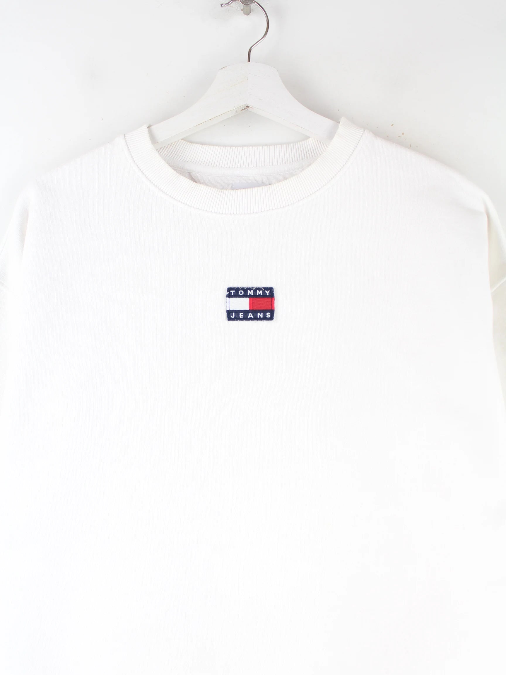 Weißer Sweater mit Stick der Brand Tommy Hilfiger in Größe L. Er ist aus einer Baumwollmischung gemacht. Den Zustand würden wir als 'In Ordnung' bezeichnen (vergl. Bilder).