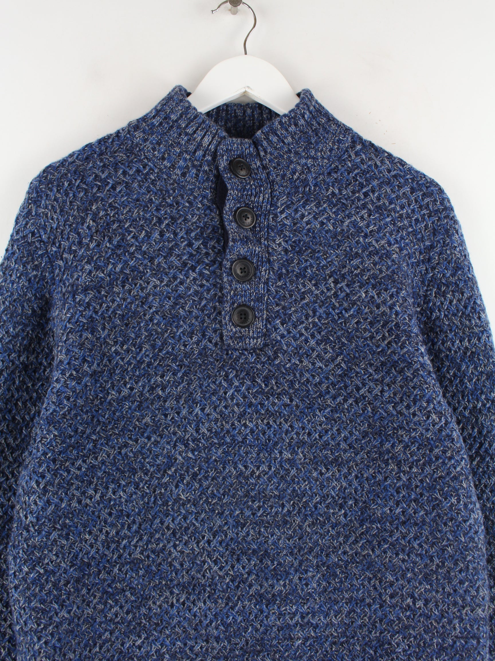 Pullover des Labels Tommy Hilfiger in Größe L. Er ist aus einer Wollmischung und in Blau bei uns vorrätig.