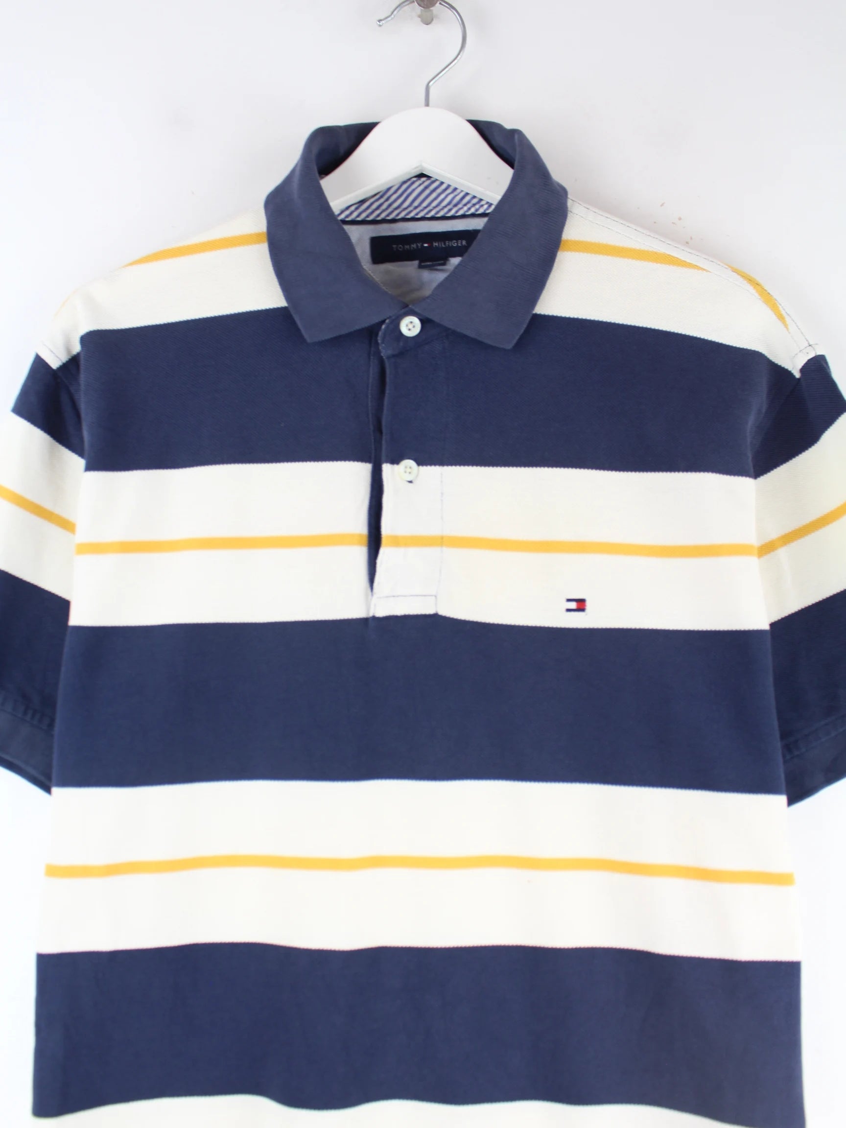 Blaues Poloshirt des Labels Tommy Hilfiger in Größe M. Es ist aus Baumwolle gefertigt und in sehr gutem Zustand bei uns vorrätig.