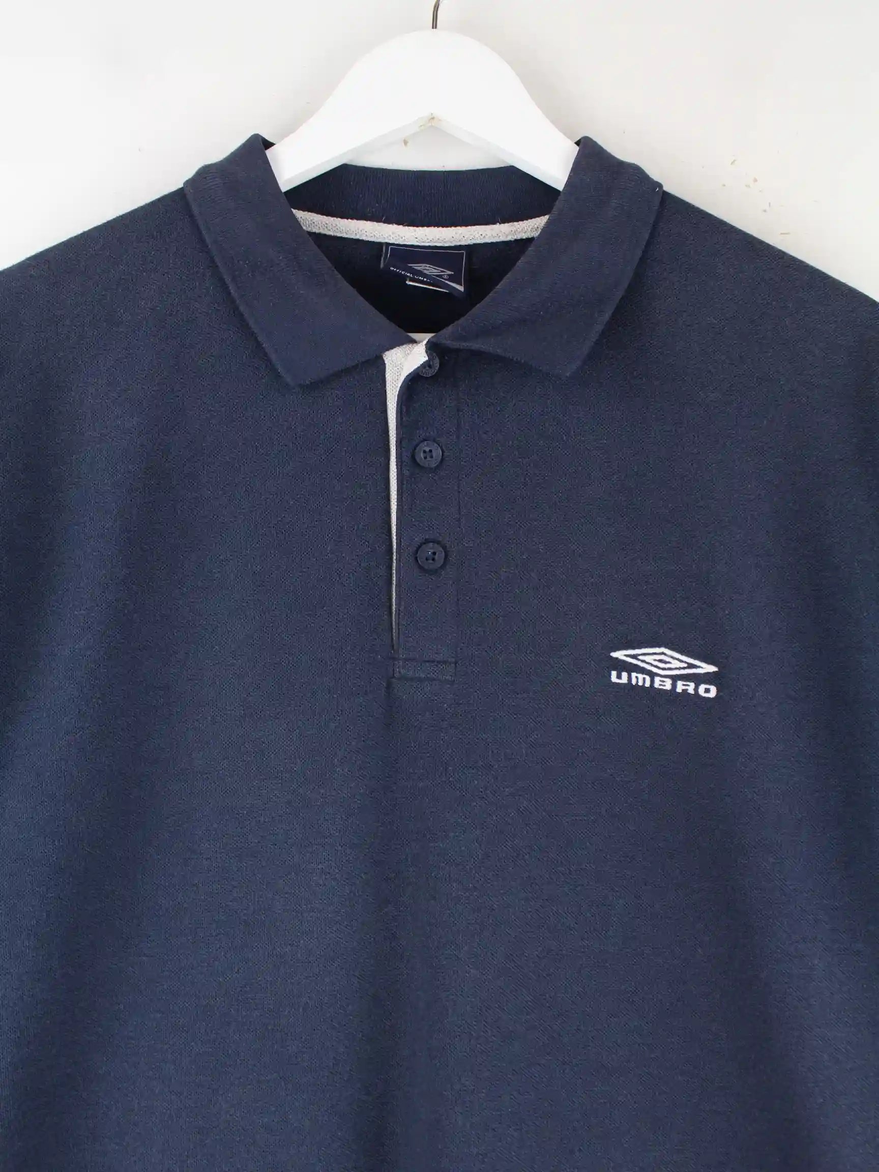 Poloshirt der Marke Umbro in Größe L. Es ist aus Baumwolle gefertigt und in Blau zu bekommen.