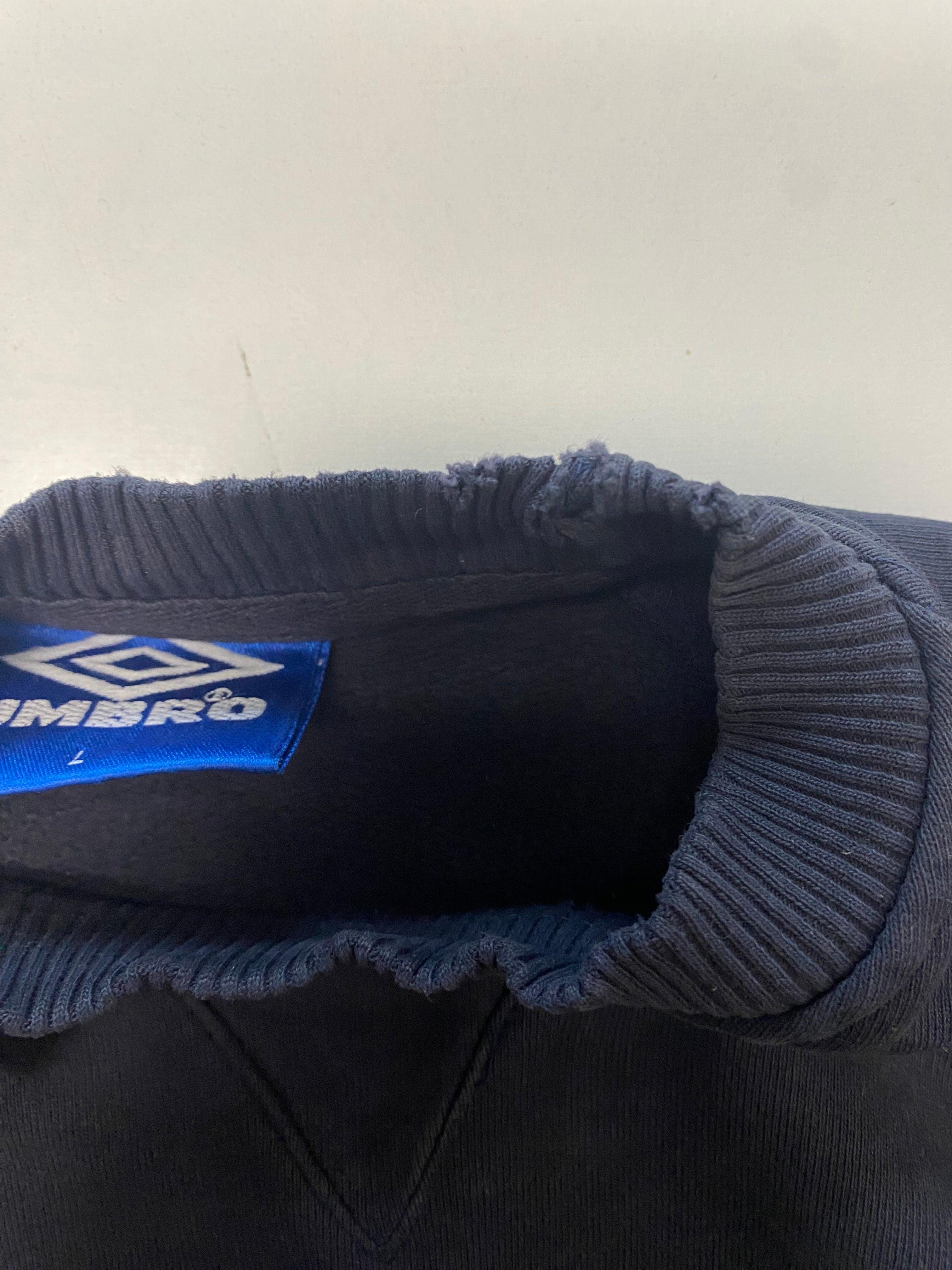 Black sweater with embroidered logo of the brand Umbro from the 90's in size L. It is made of a cotton blend and is in stock