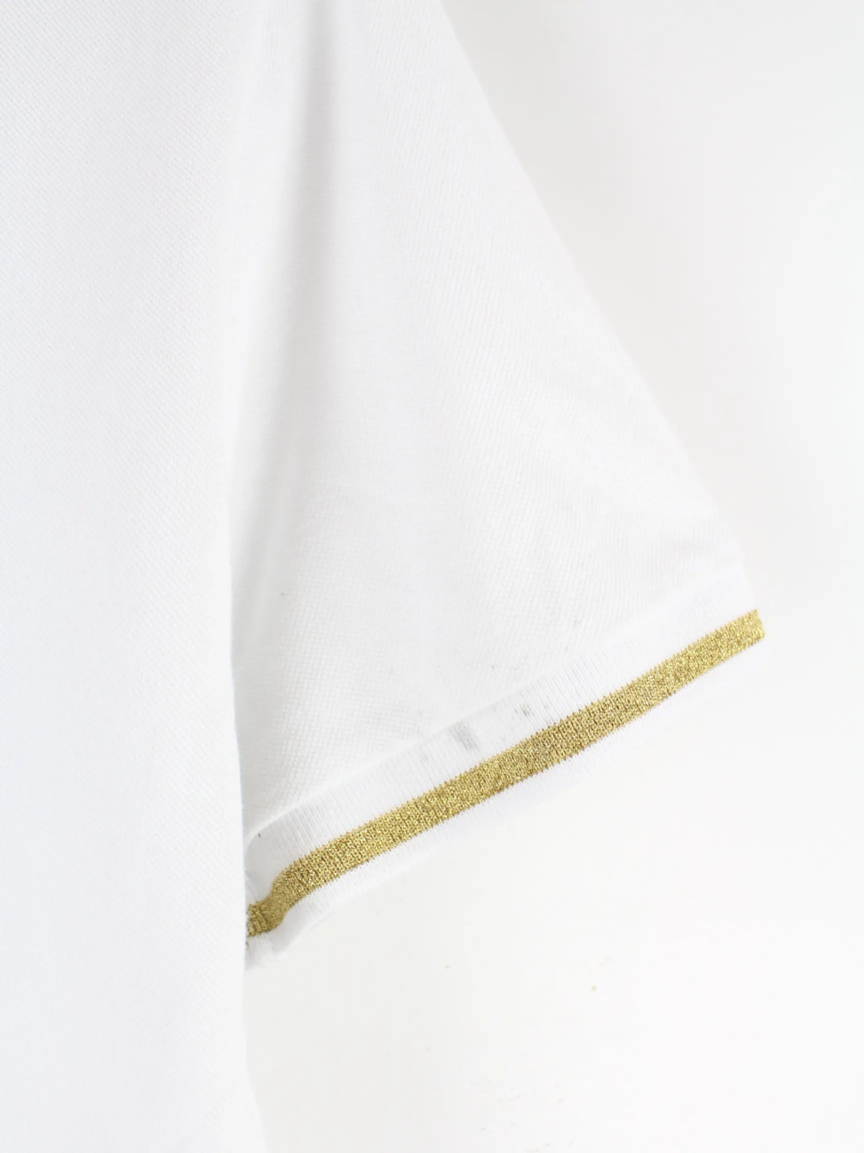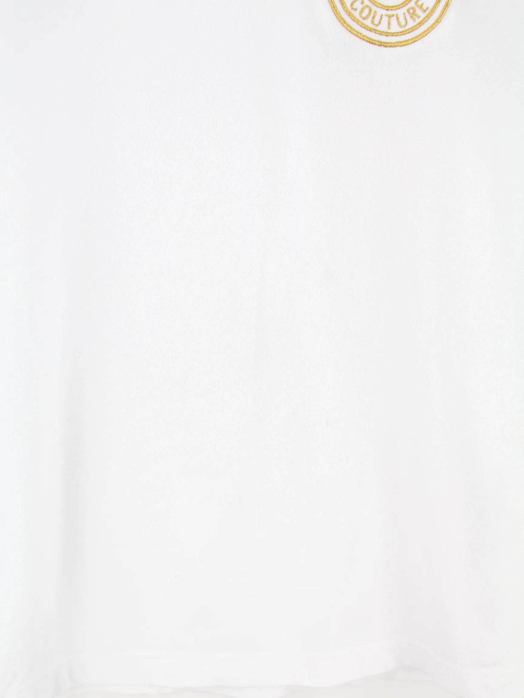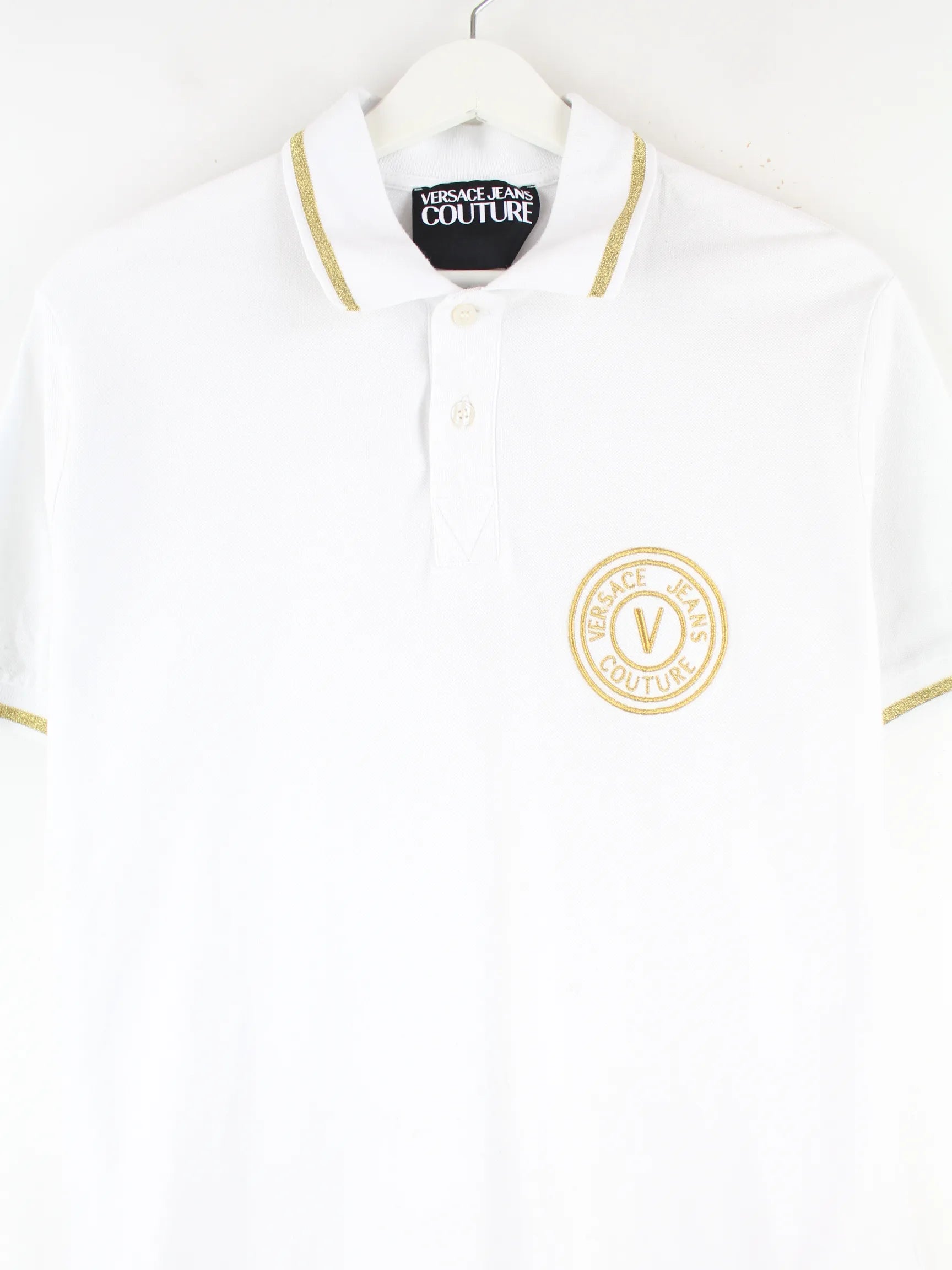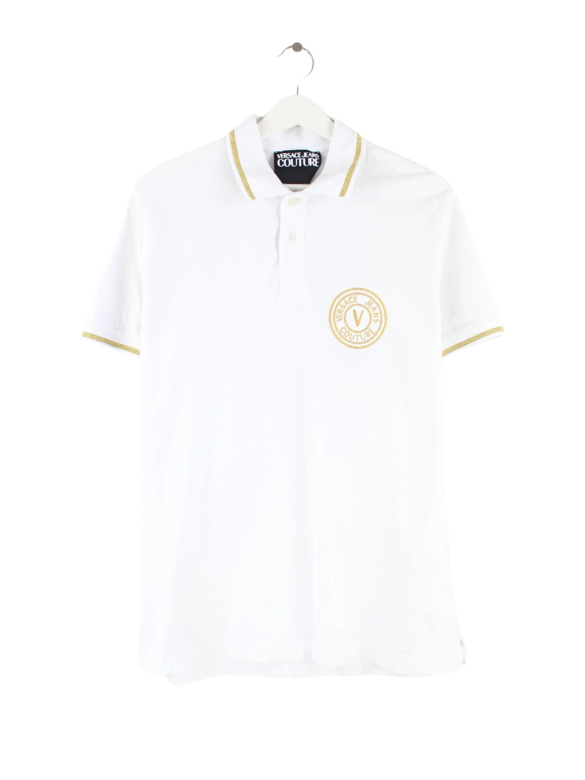 Weißes Poloshirt mit Stick aus dem Hause Versace in Größe L. Es ist aus Baumwolle produziert. Den Zustand würden wir als 'In Ordnung' bezeichnen (vergl. Bilder).