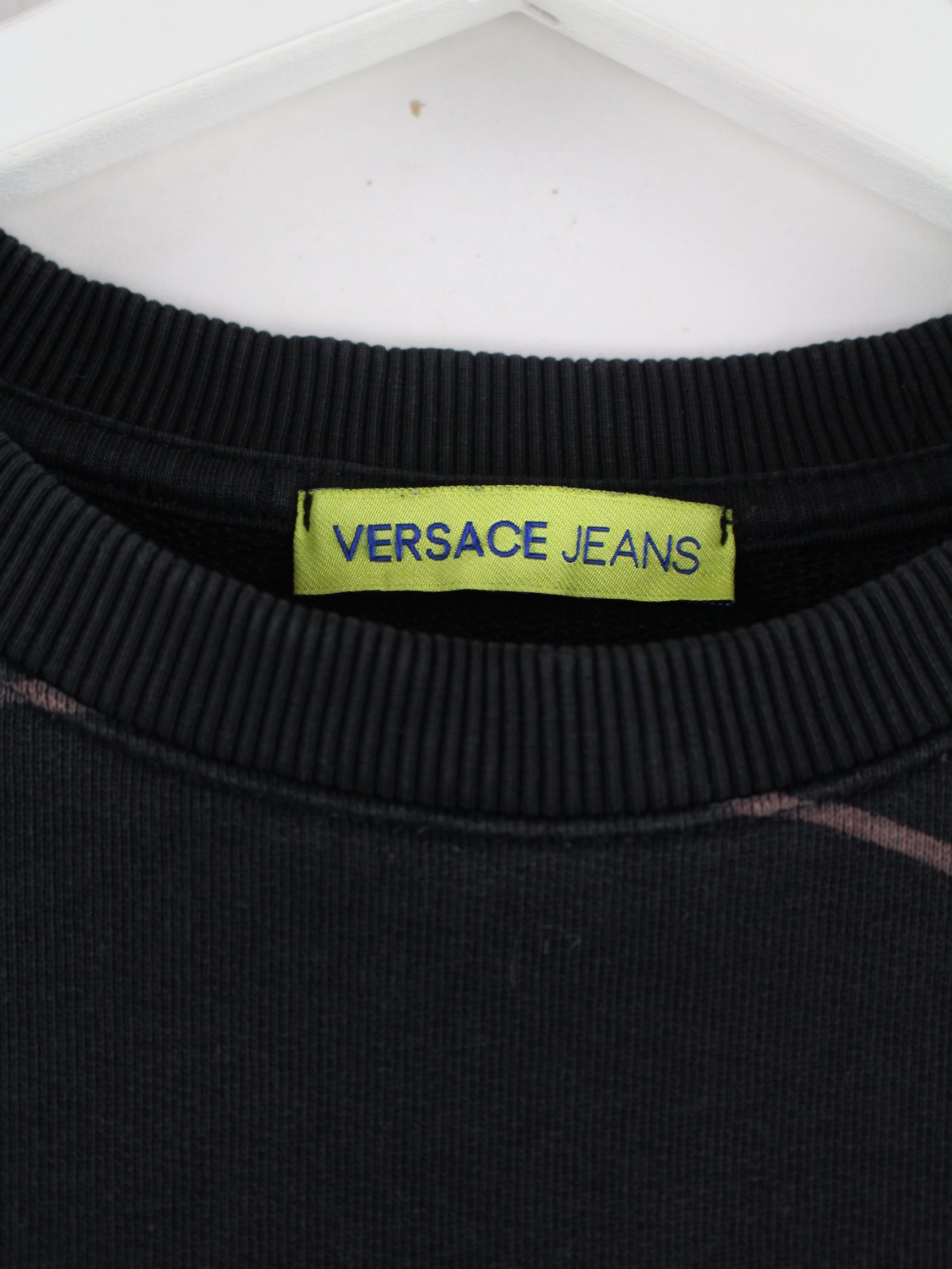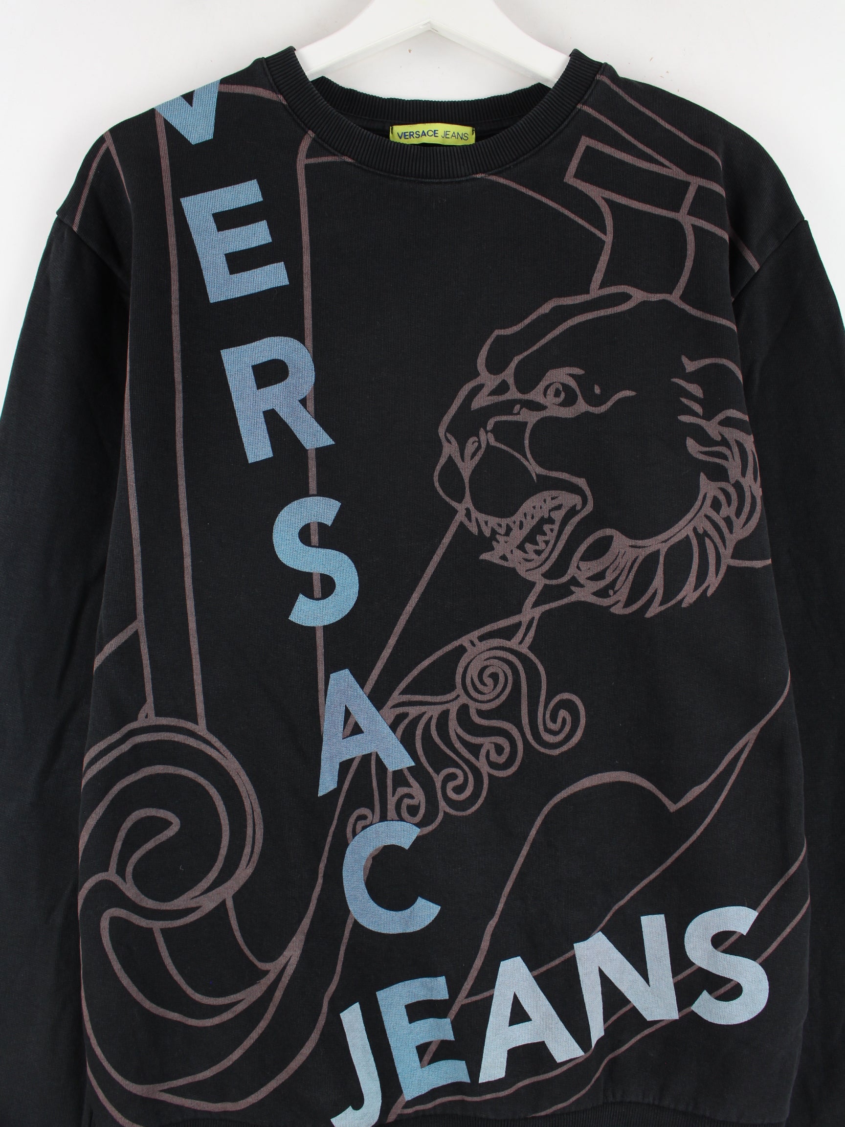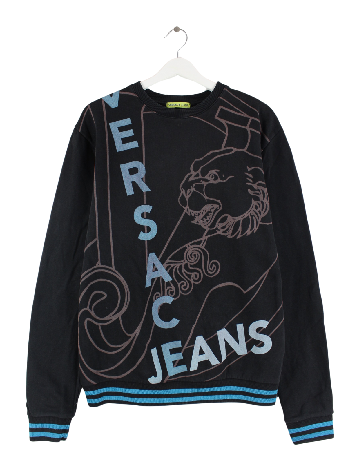 Schwarzer Sweater des Labels Versace in Größe L. Er ist aus einer Baumwollmischung hergestellt und in gutem Zustand auf Lager. Mit schickem Print.