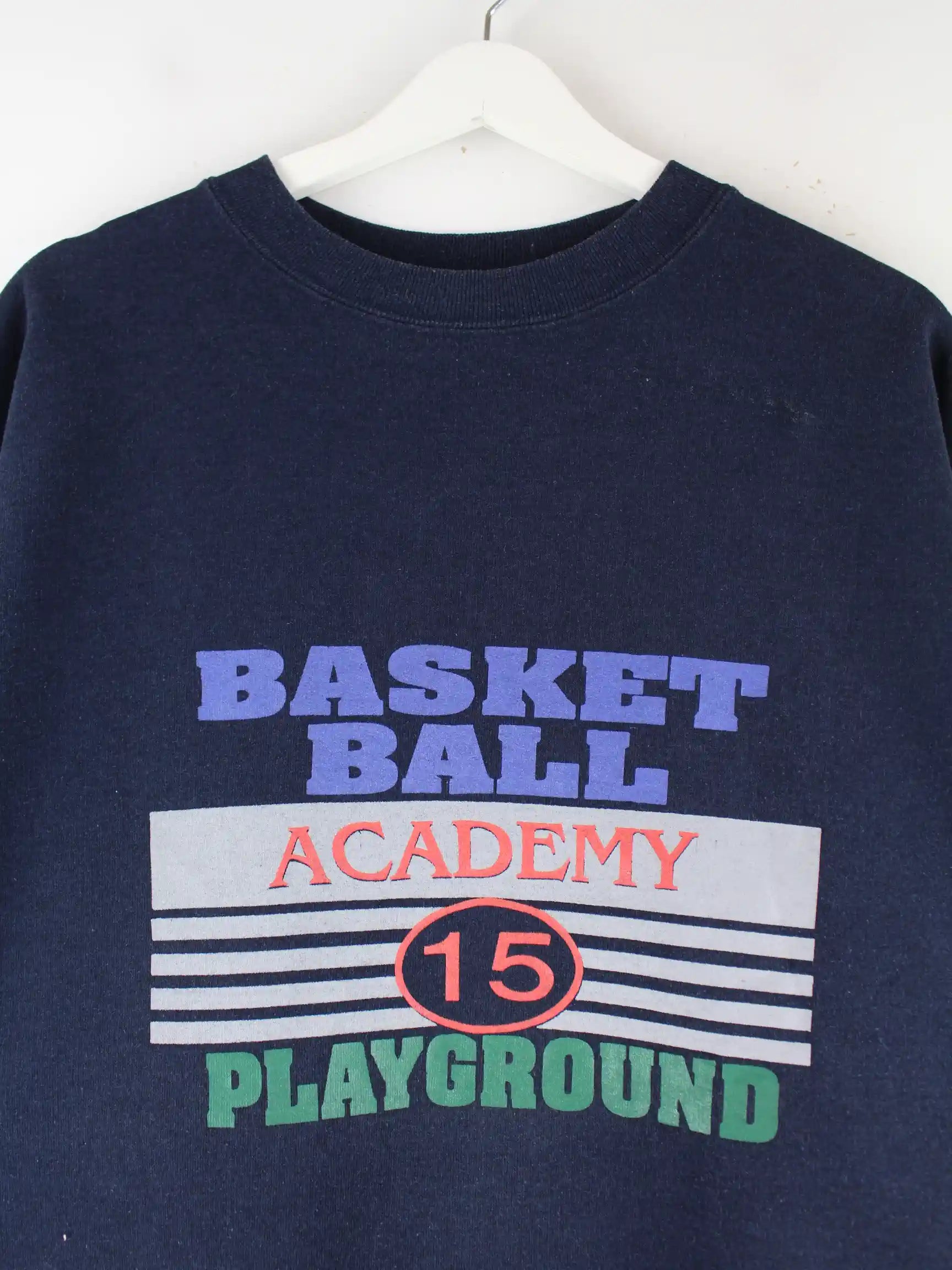 Blauer Vintage Sweater in Größe XL. Er ist aus einer Baumwollmischung und in gutem Zustand vorrätig. Mit chiquem Basketball Print.