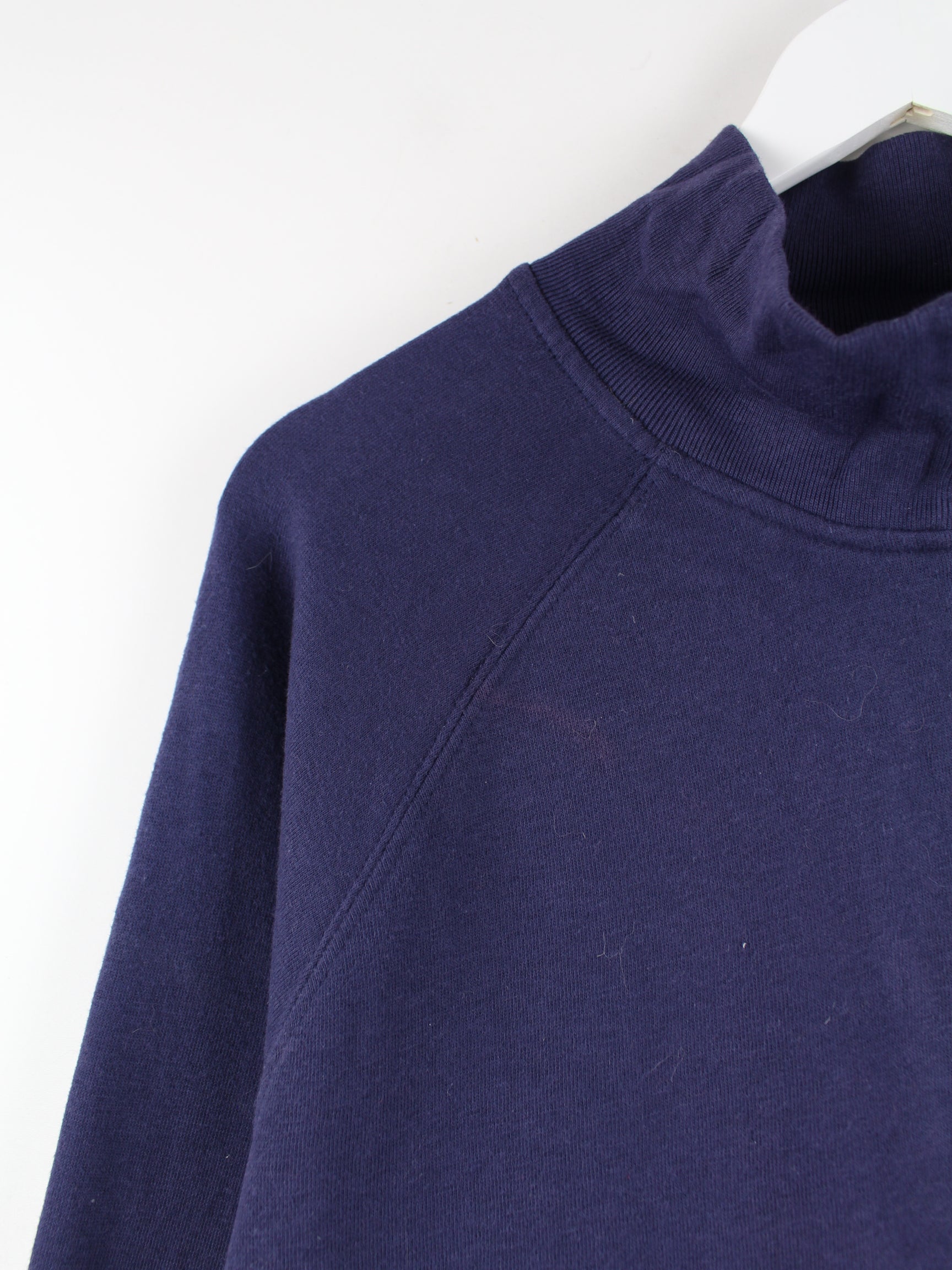 Blauer Vintage Sweater mit Stickereien und kurzem Reißverschluß in Größe XL. Er ist aus einer Baumwollmischung produziert und in gutem Zustand zu haben.
