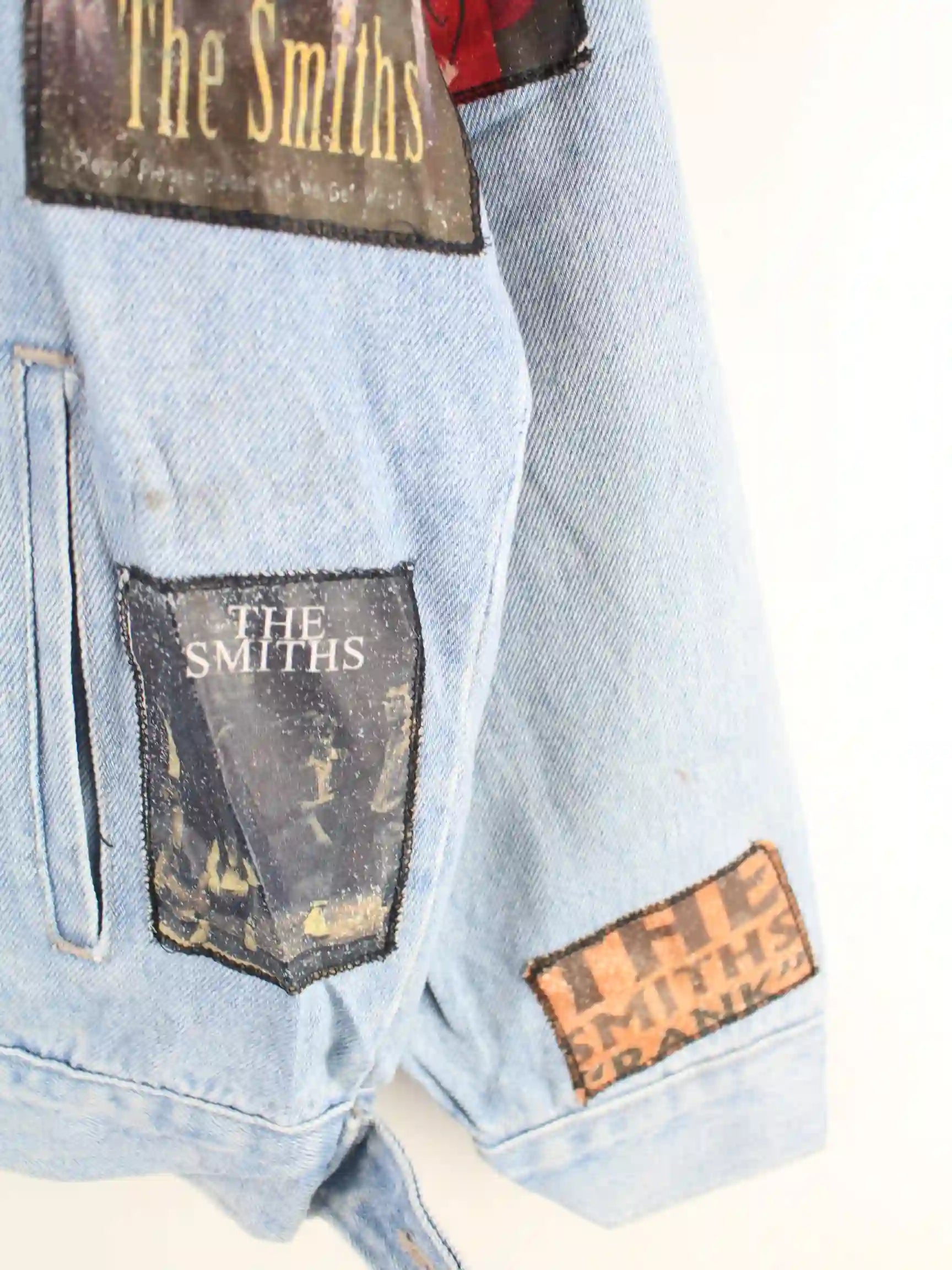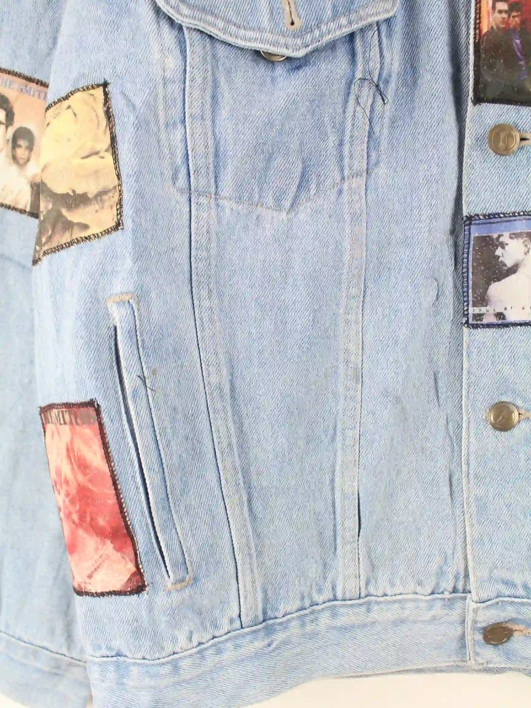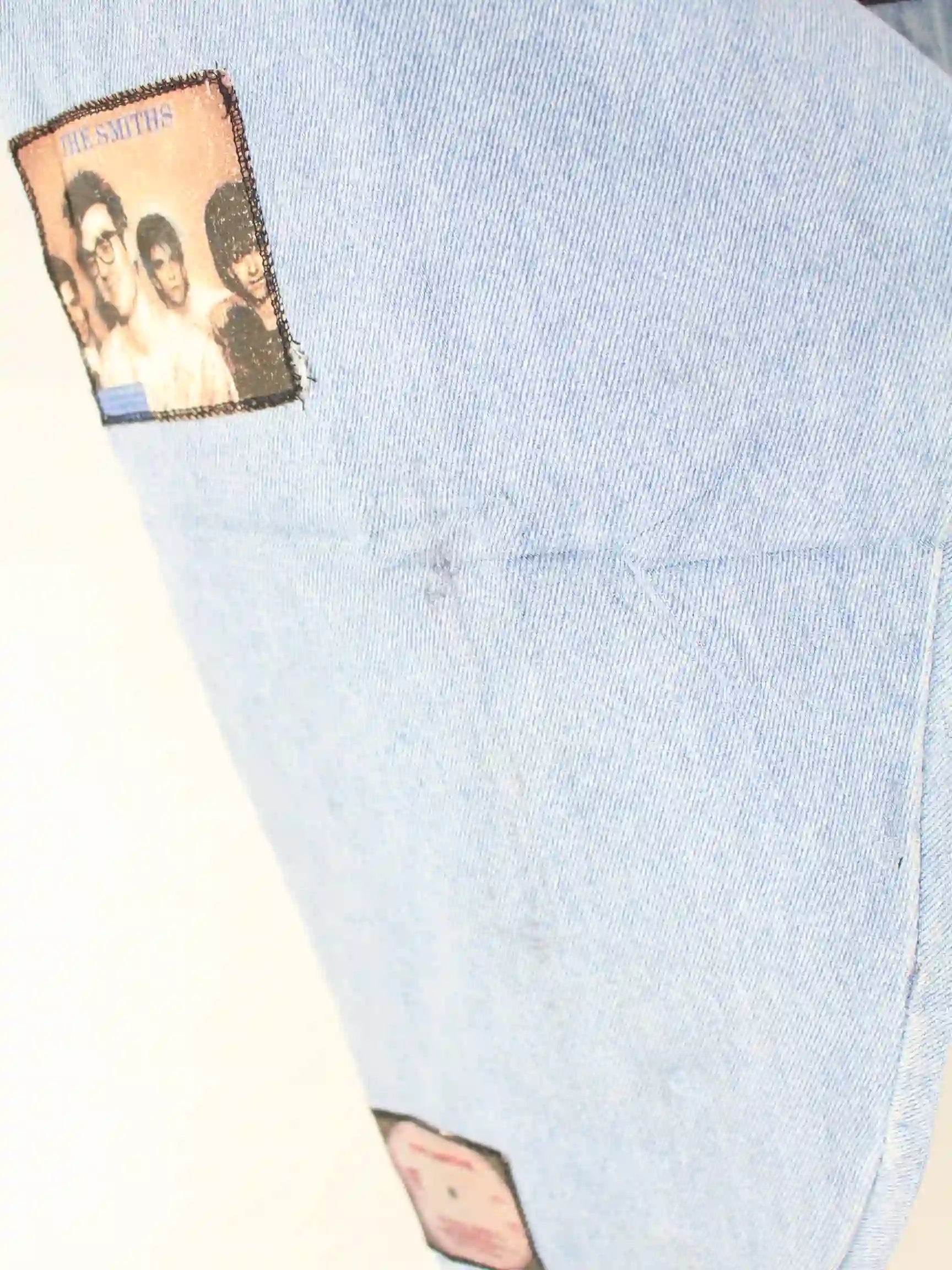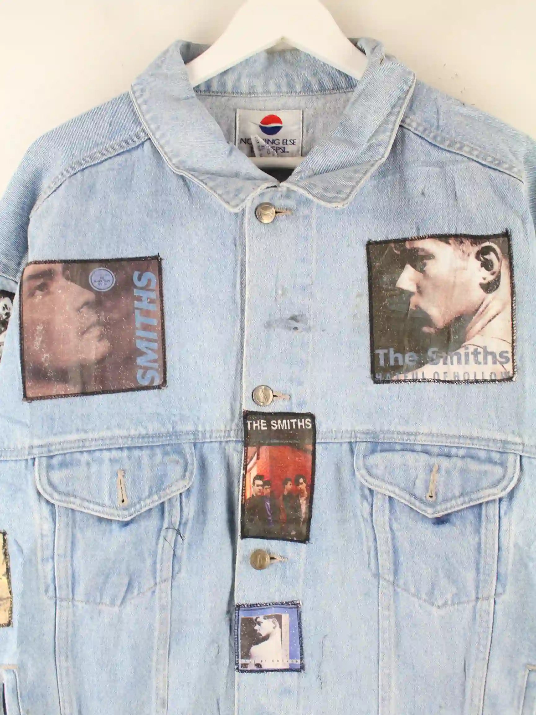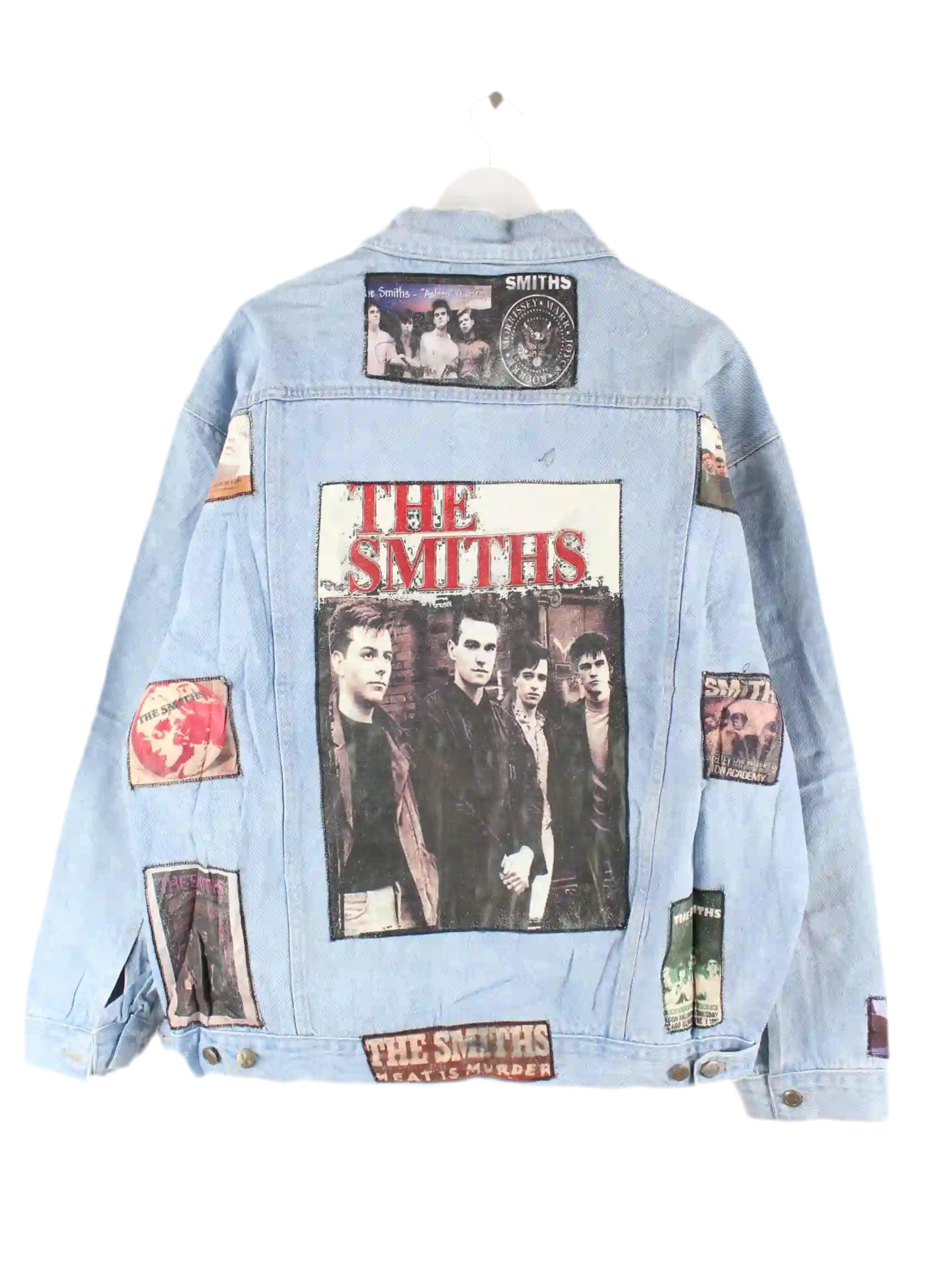 Blaue Vintage Patch Jeansjacke aus den 80'ern in Größe XL. Sie ist aus Baumwolle gefertigt. Den Zustand würden wir als 'In Ordnung' bezeichnen (vergl. Bilder).