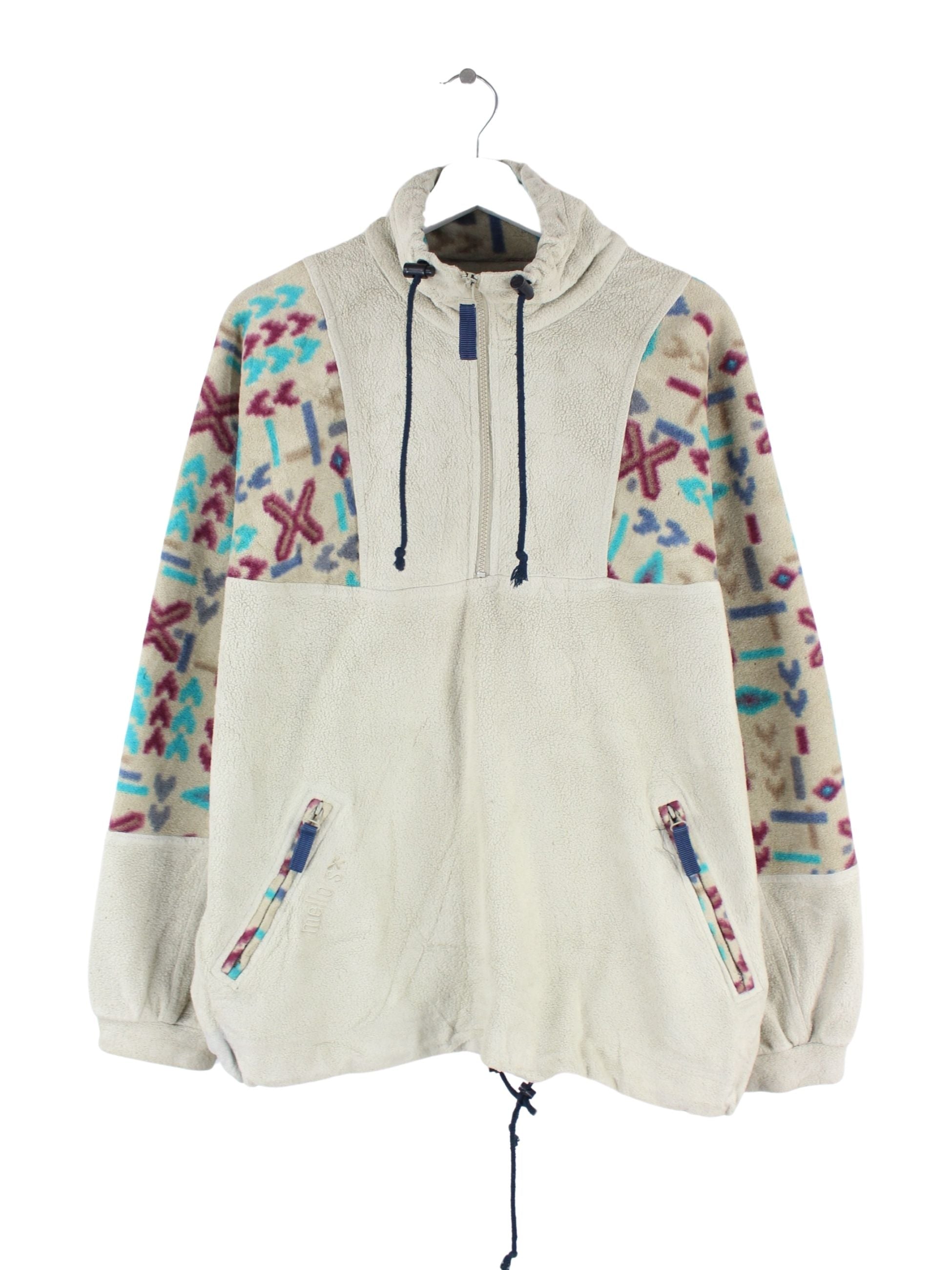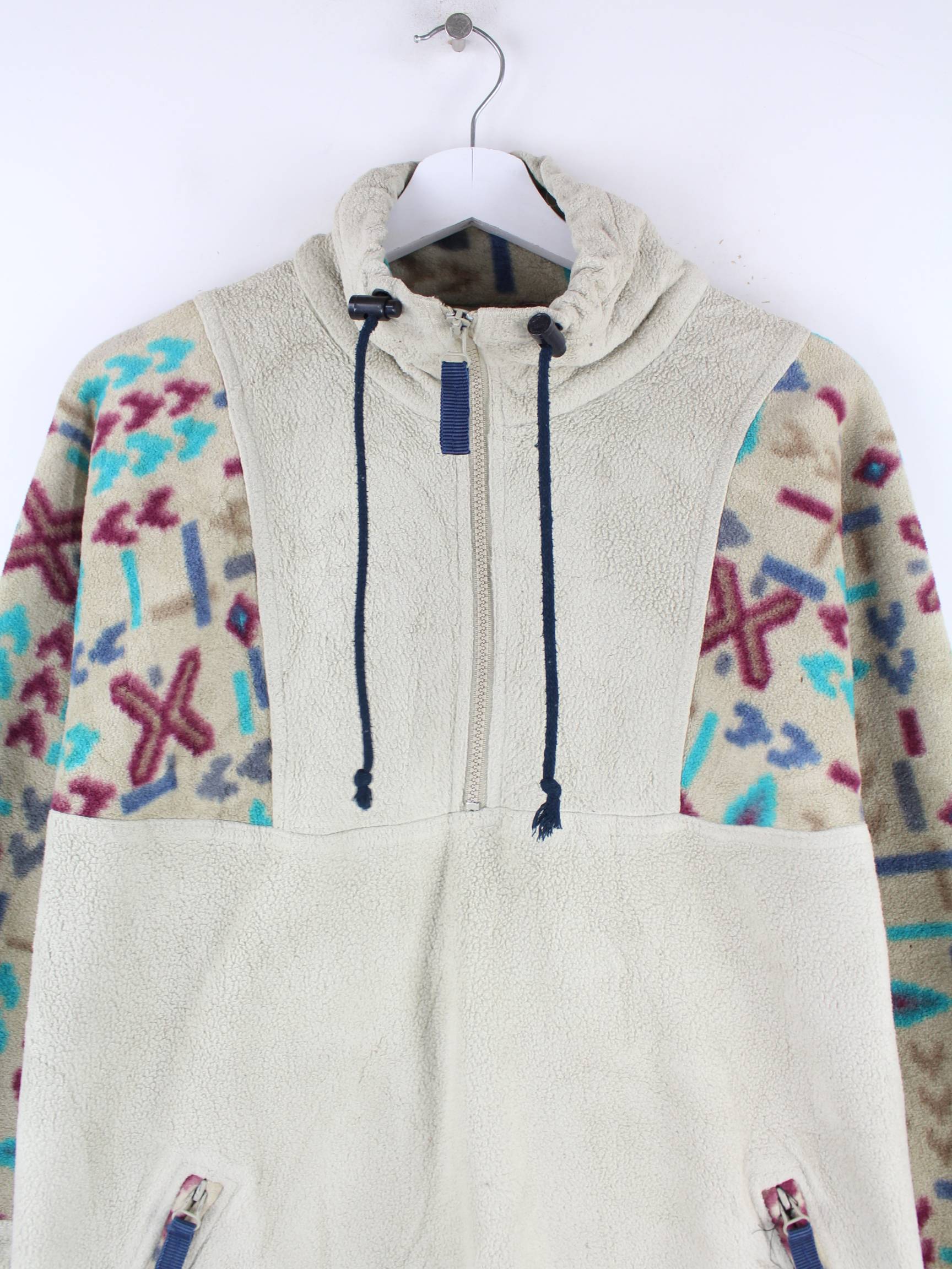 Beigefarbener Vintage Sweater mit kurzem Reißverschluß aus den 80'ern in Größe XL. Er ist aus behaglichem Fleece gemacht. Den Zustand würden wir als 'In Ordnung' bezeichnen (vergl. Bilder).