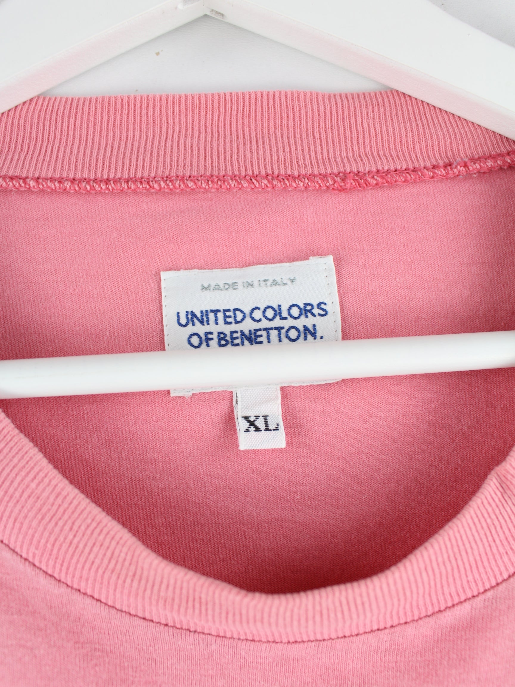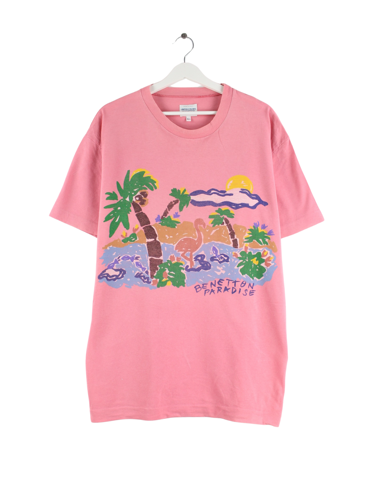 Pink vintage T-shirt from the 80's in size XL. It is made of cotton and is available from us in good condition. With a beautiful Paradise print.