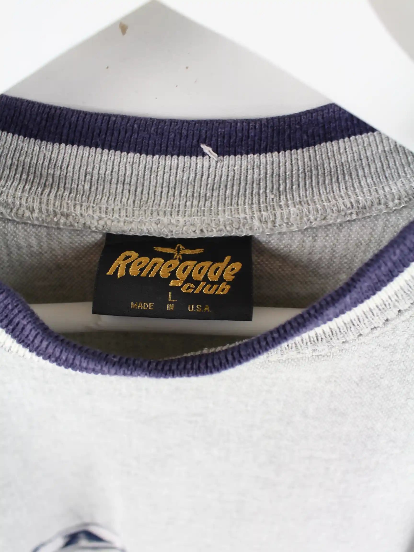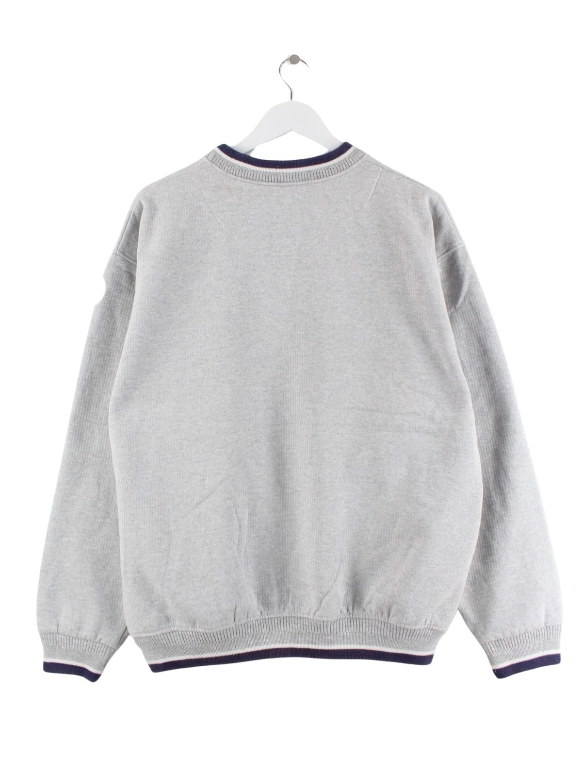 Vintage Sweater mit Stickereien in Größe L aus den 90'ern. Er ist aus einer Baumwollmischung gemacht und in Grau zu haben.