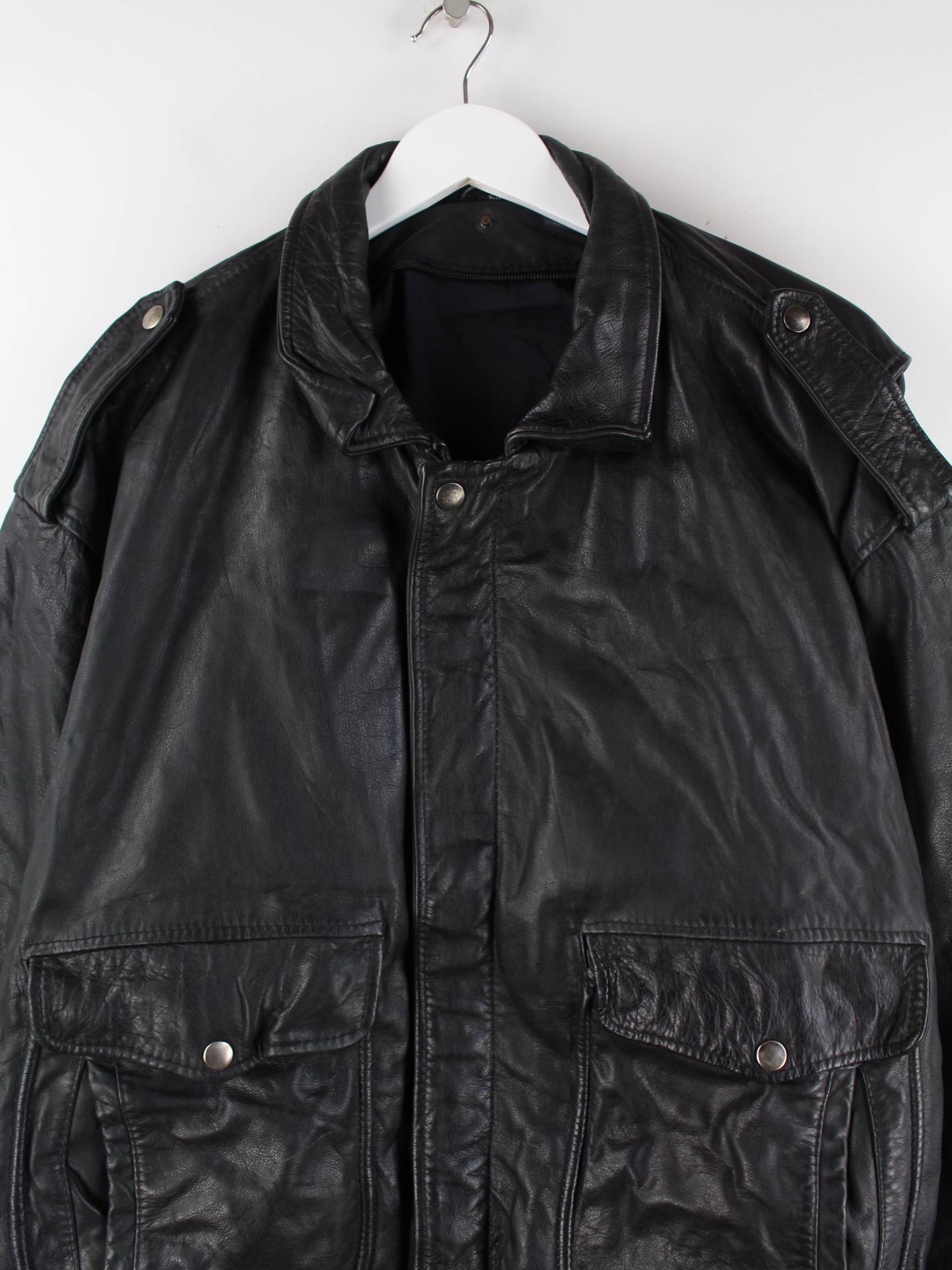 Vintage Jacke in Größe XL aus den 90'ern. Sie ist aus Leder und in Schwarz auf Lager.