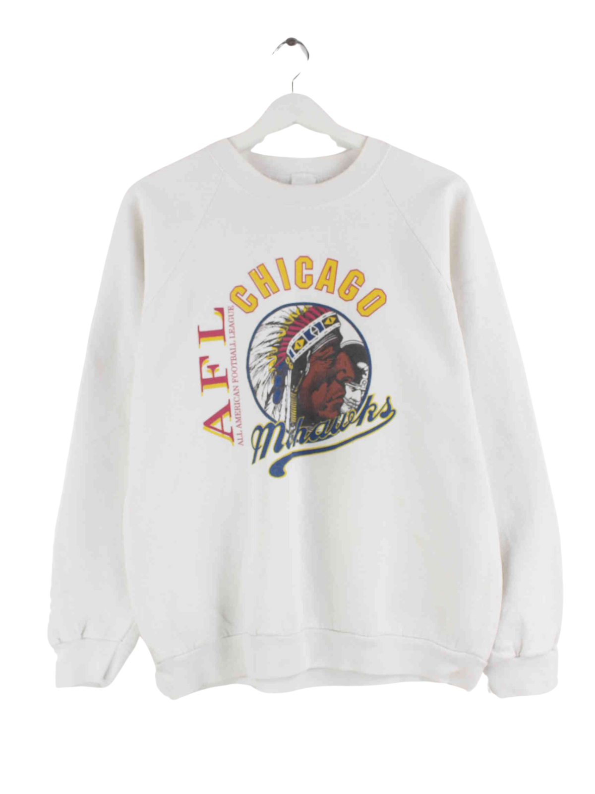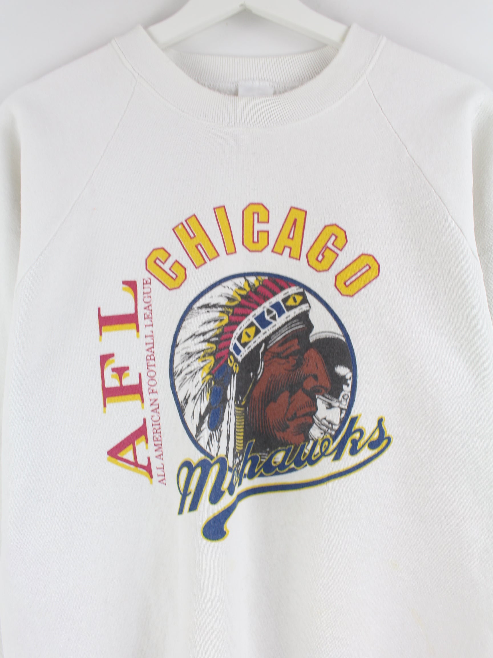 Vintage sweater in size S from the 90's. It is made from a cotton blend and is available in white. With a beautiful Chicago print.