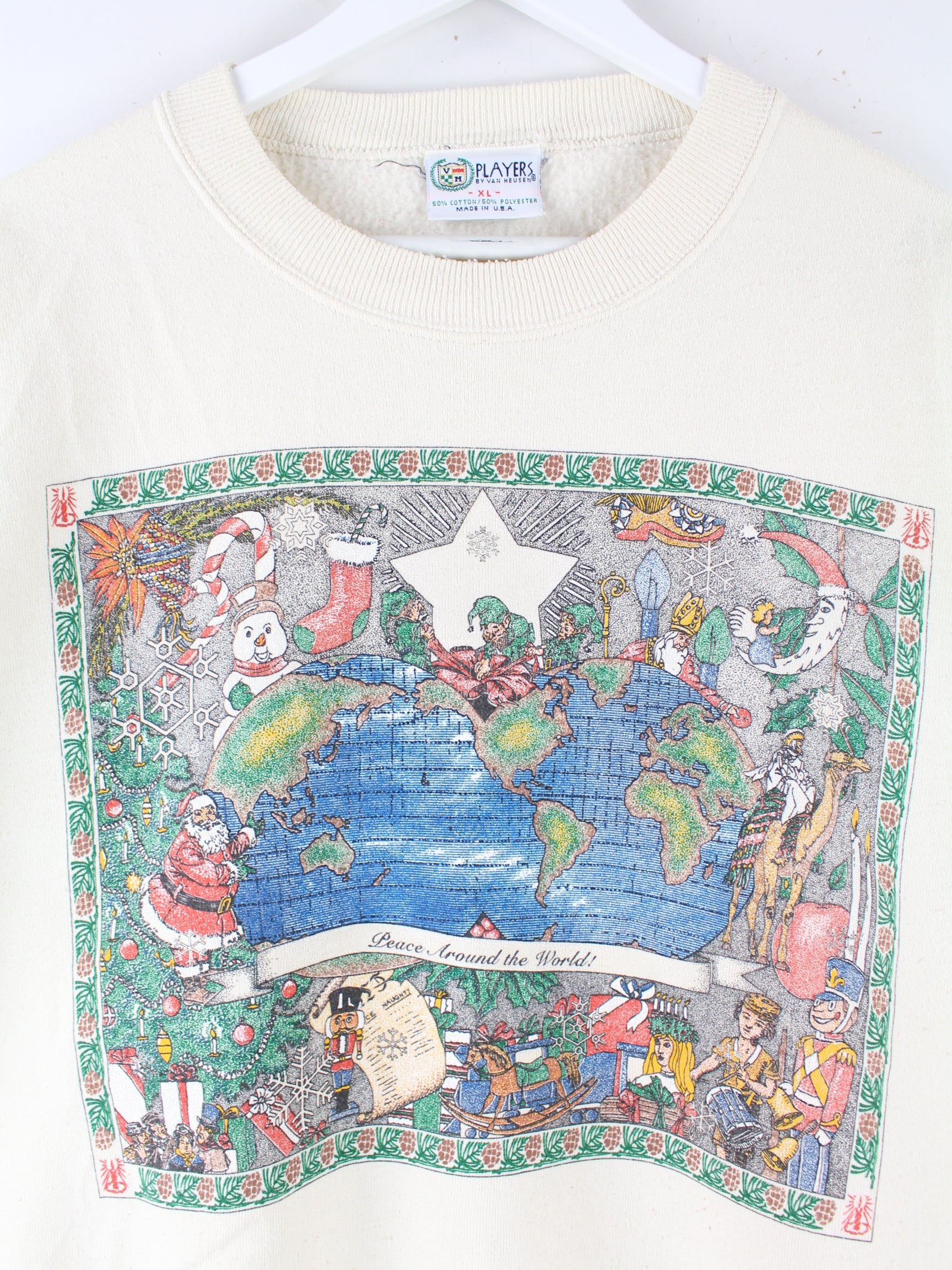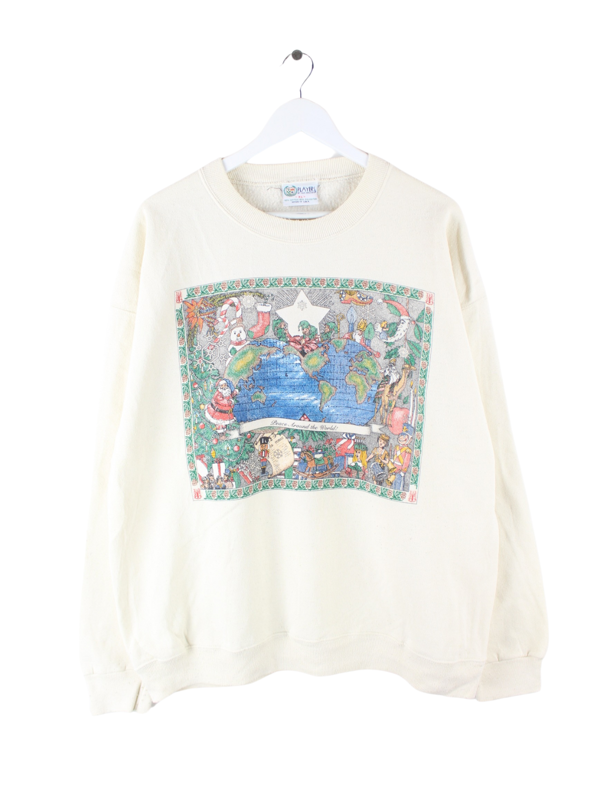 Beigefarbener Vintage Sweater aus den 90'ern in Größe XL. Er ist aus einer Baumwollmischung angefertigt und in sehr gutem Zustand zu bekommen. Mit seltenem Christmas Print.