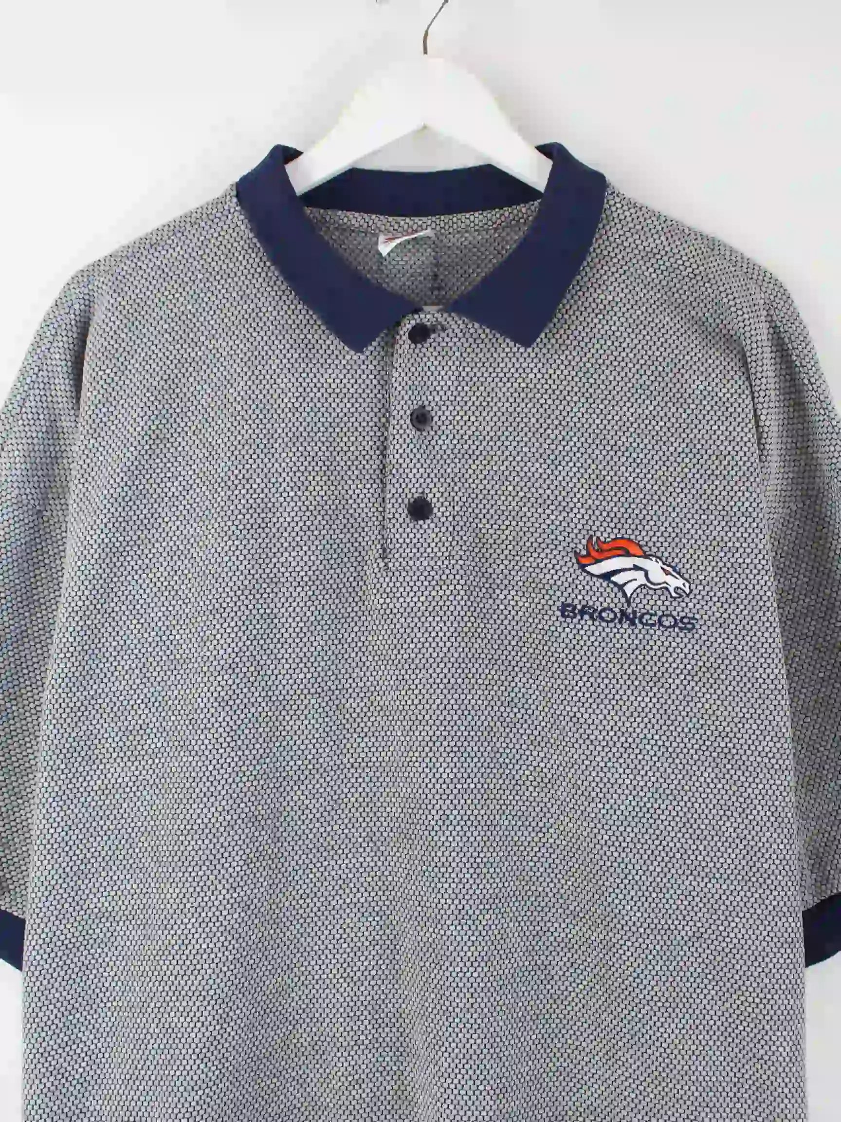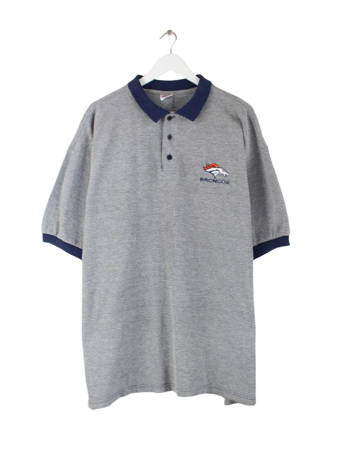 Vintage Poloshirt in Größe XL aus den 90'ern vom NFL Football Team Denver Broncos. Es ist aus Baumwolle produziert und in Grau zu bekommen.