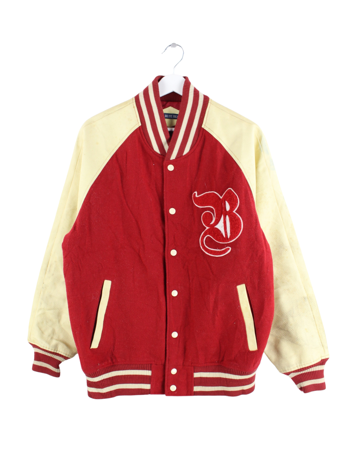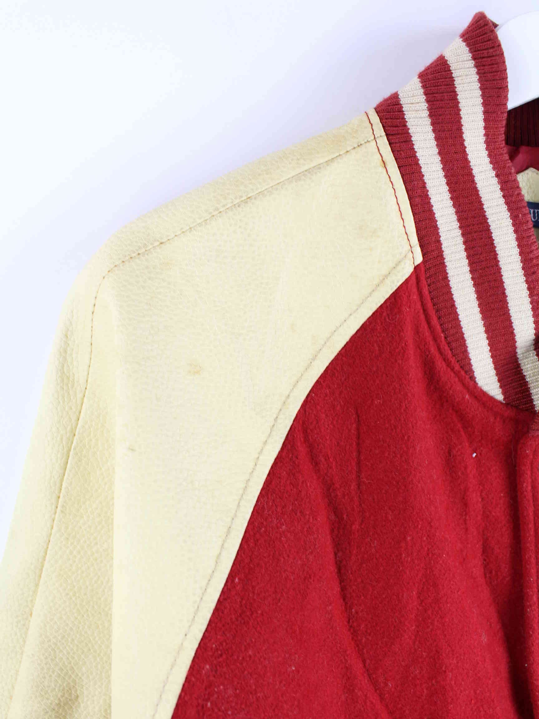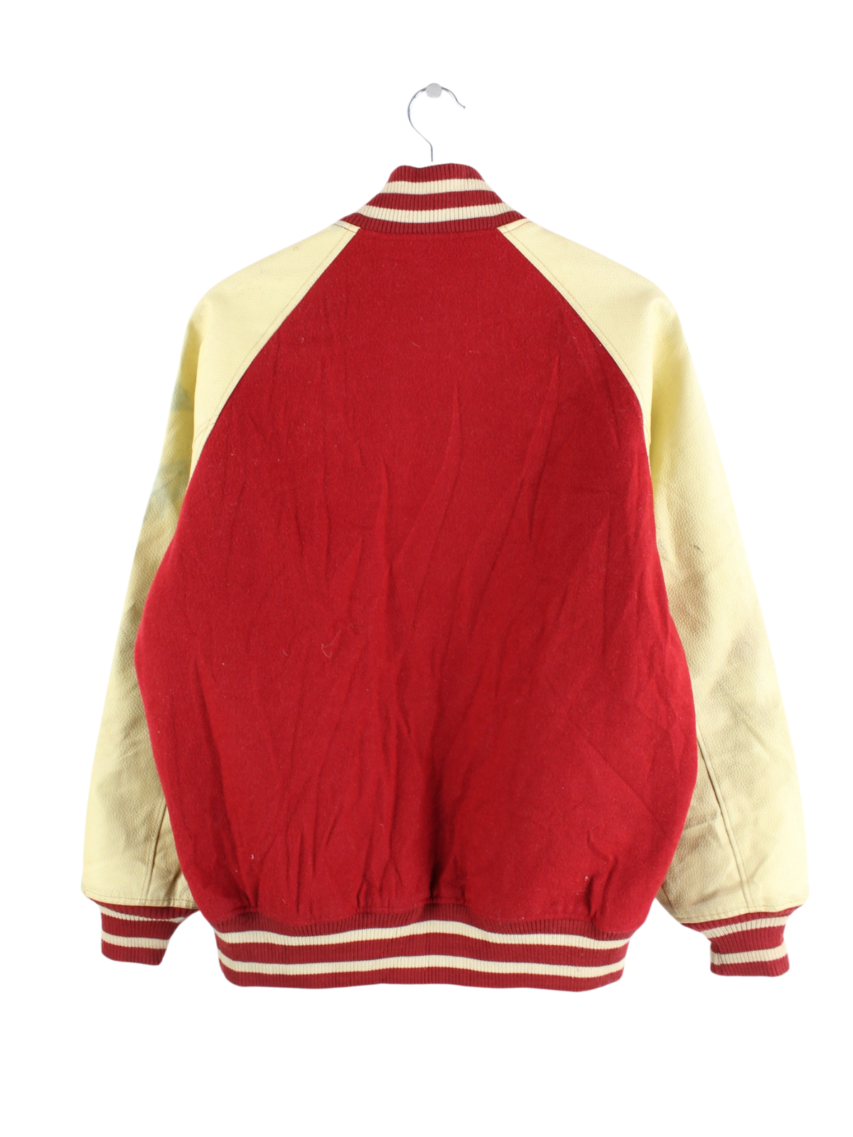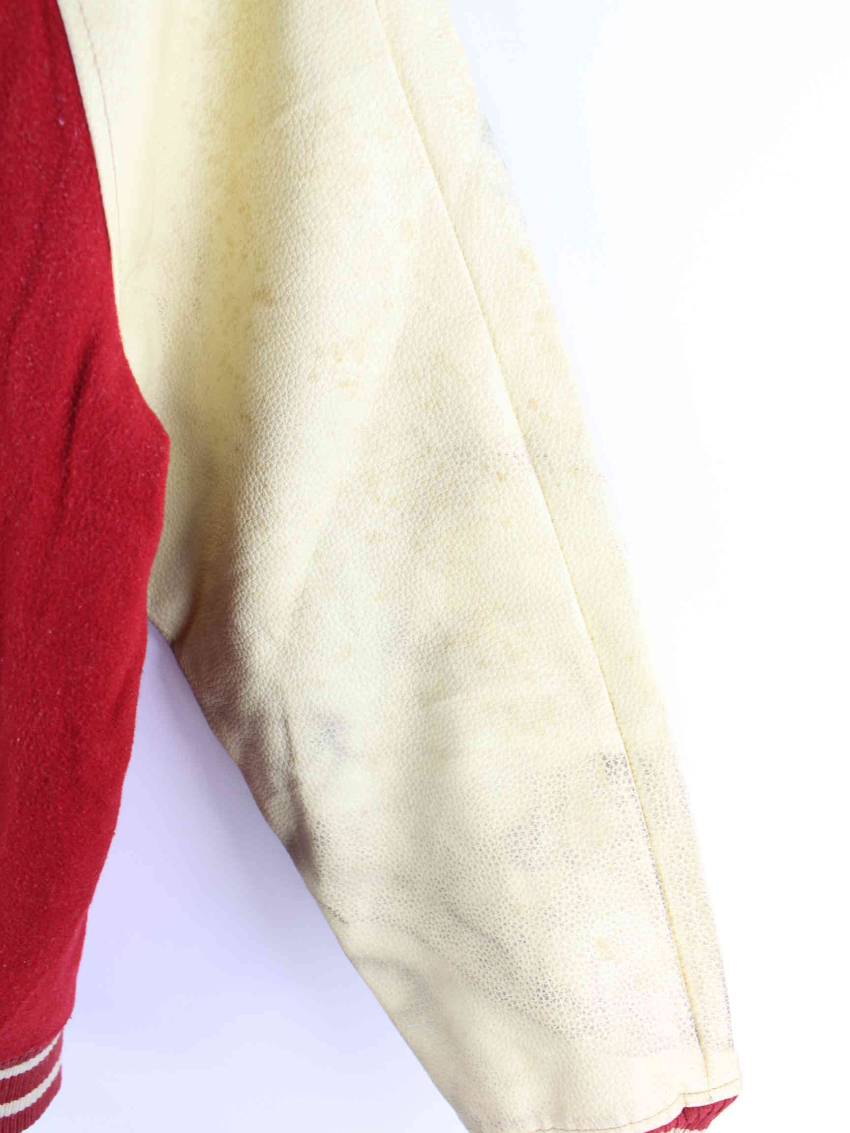 Vintage jacket with embroidery in size L from the 90s. It is made of mixed fabric and is available in red.