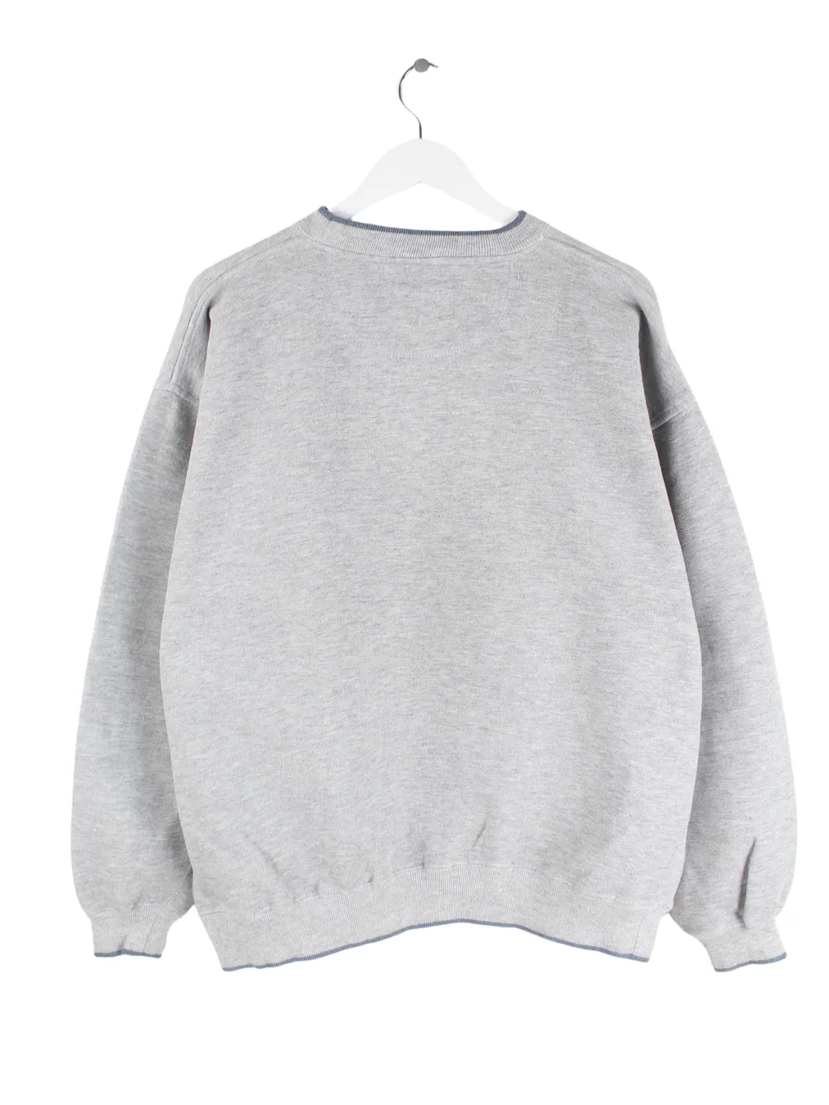 Grauer Vintage Sweater mit gesticktem Logo aus den 90'ern in Größe L. Er ist aus einer Baumwollmischung hergestellt und in sehr gutem Zustand zu bekommen.
