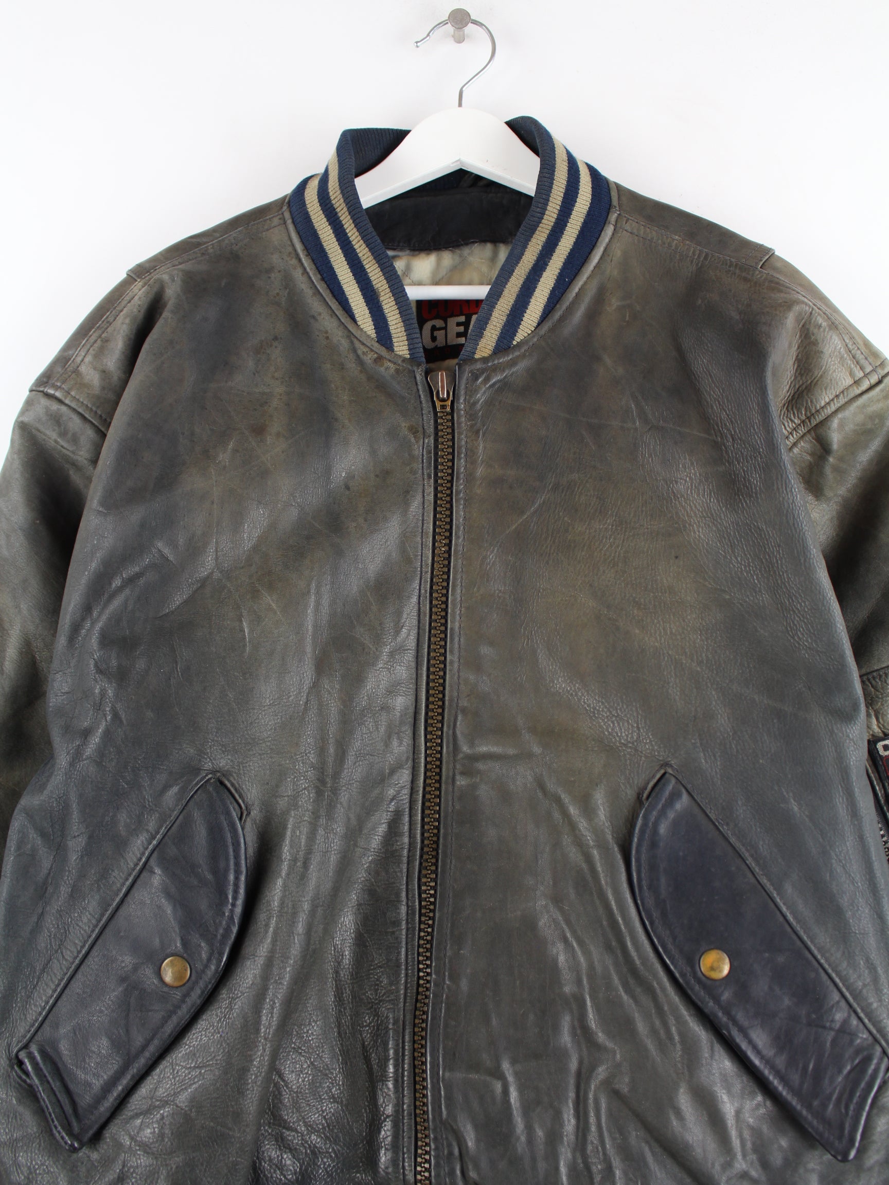Grey vintage jacket from the 90's in size XL. It is made of leather. We would describe the condition as 'fine' (see pictures).