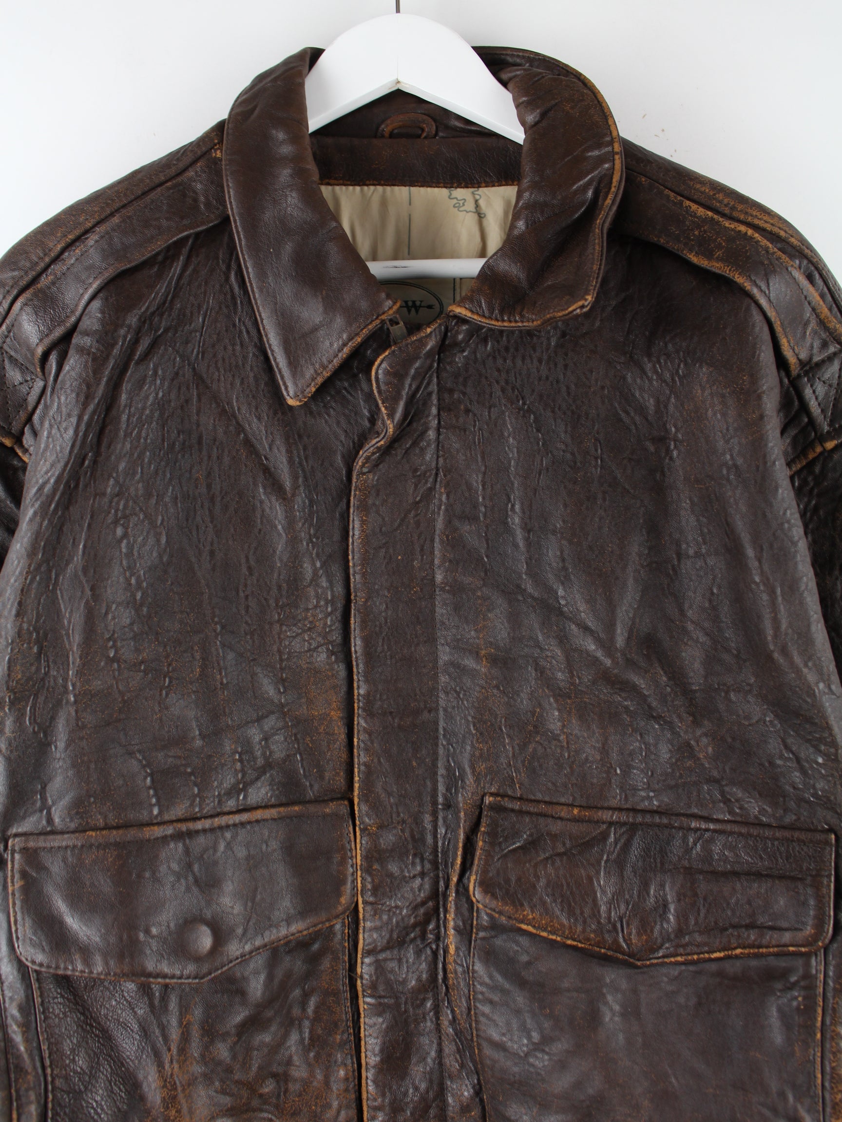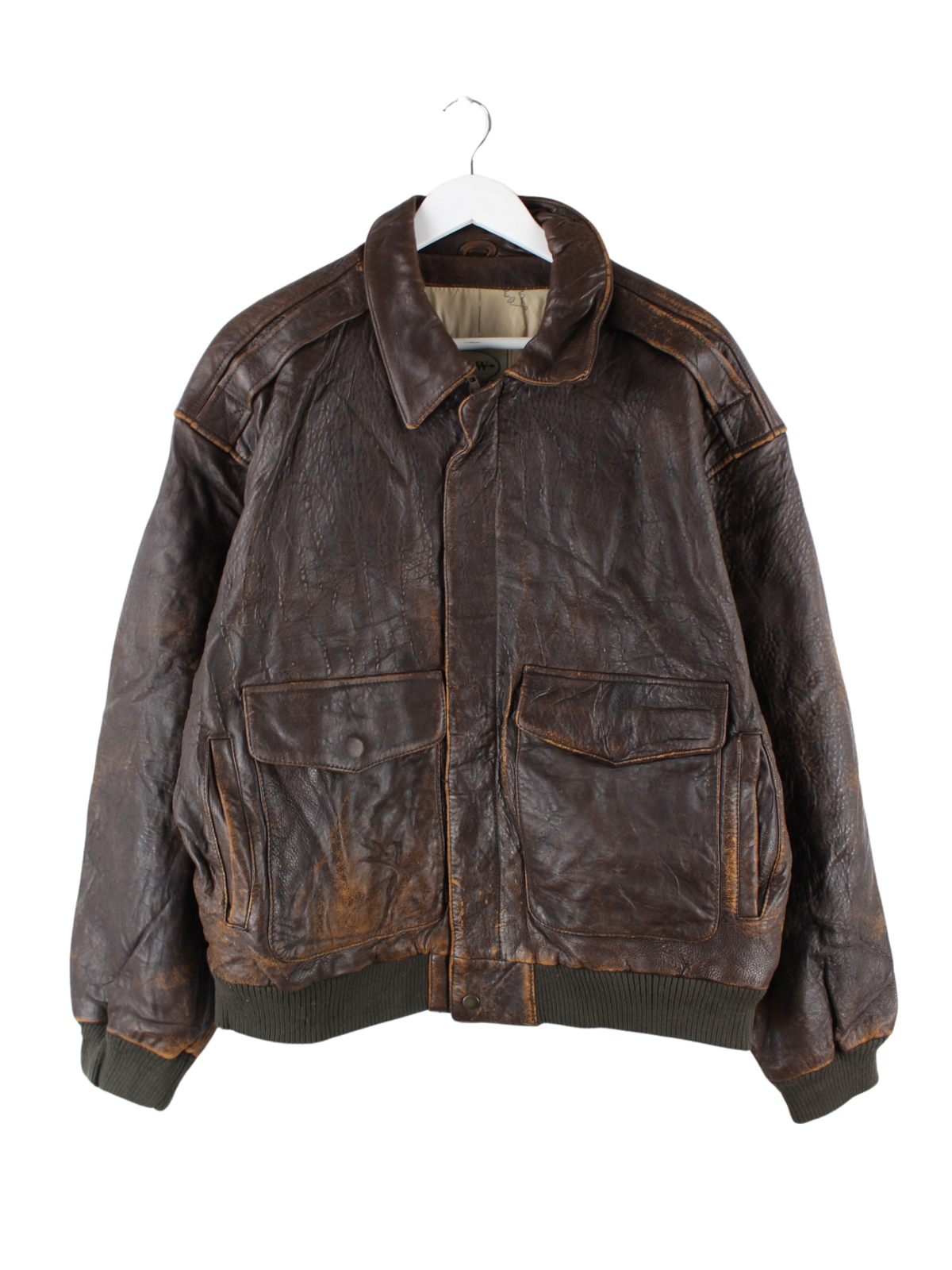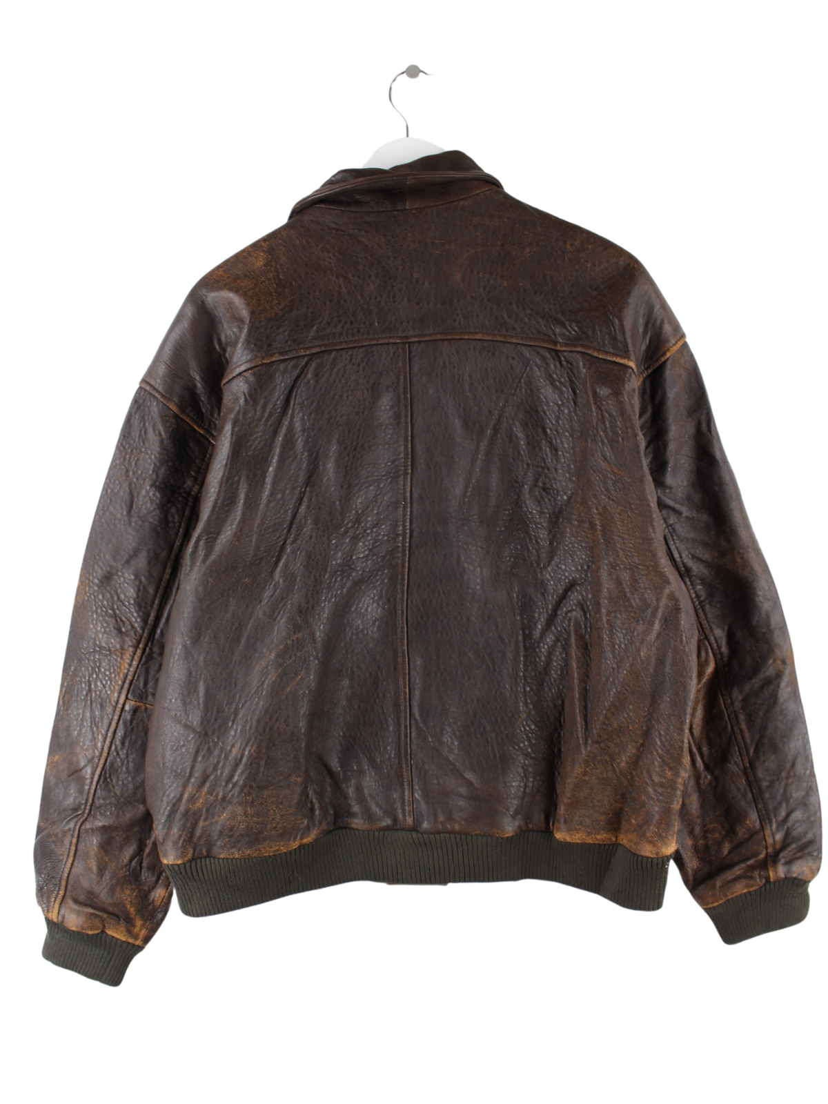 Braune Vintage Jacke aus den 90'ern in Größe M. Sie ist aus Leder hergestellt und in gutem Zustand zu bekommen.