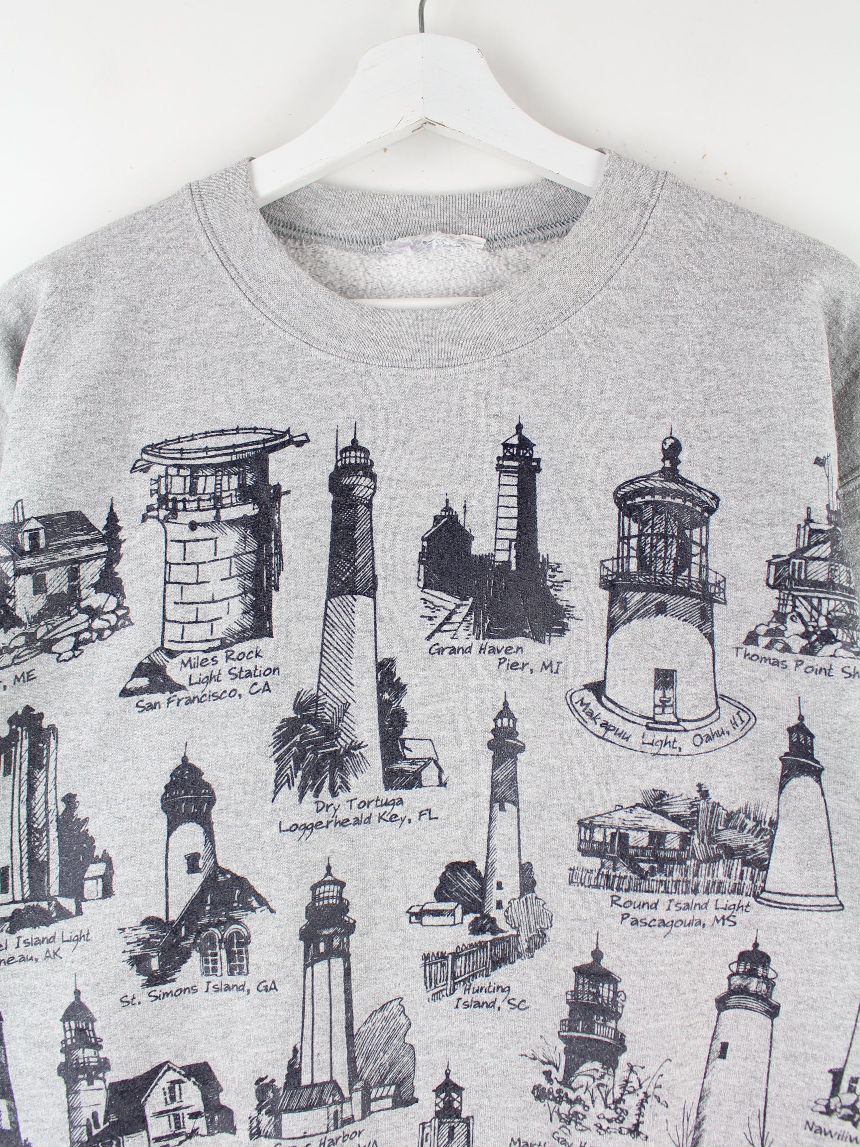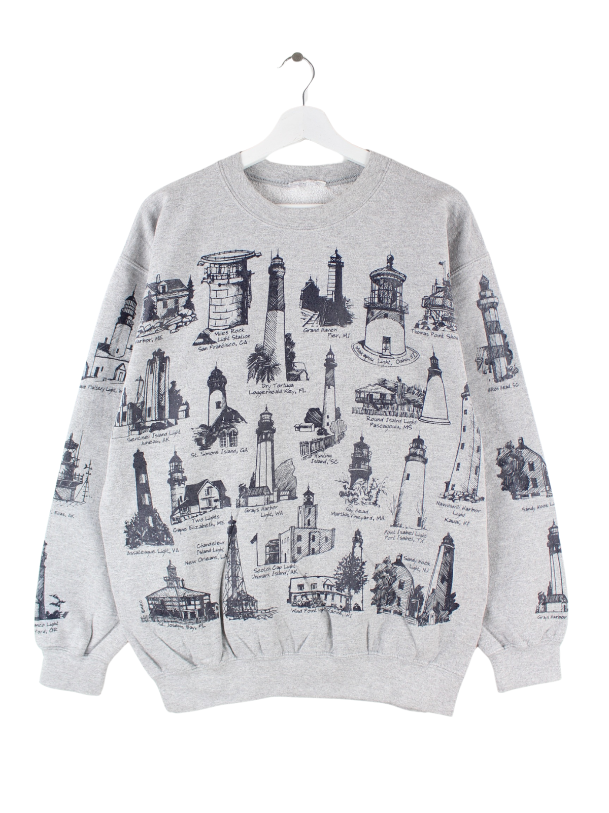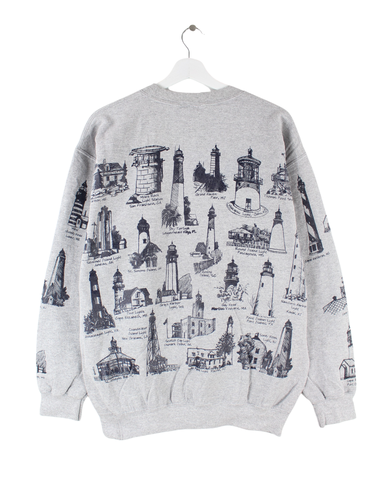 Grauer Vintage Sweater aus den 90'ern in Größe L. Er ist aus einer Baumwollmischung gefertigt und in sehr gutem Zustand zu haben. Mit schickem Lighthouse Print.