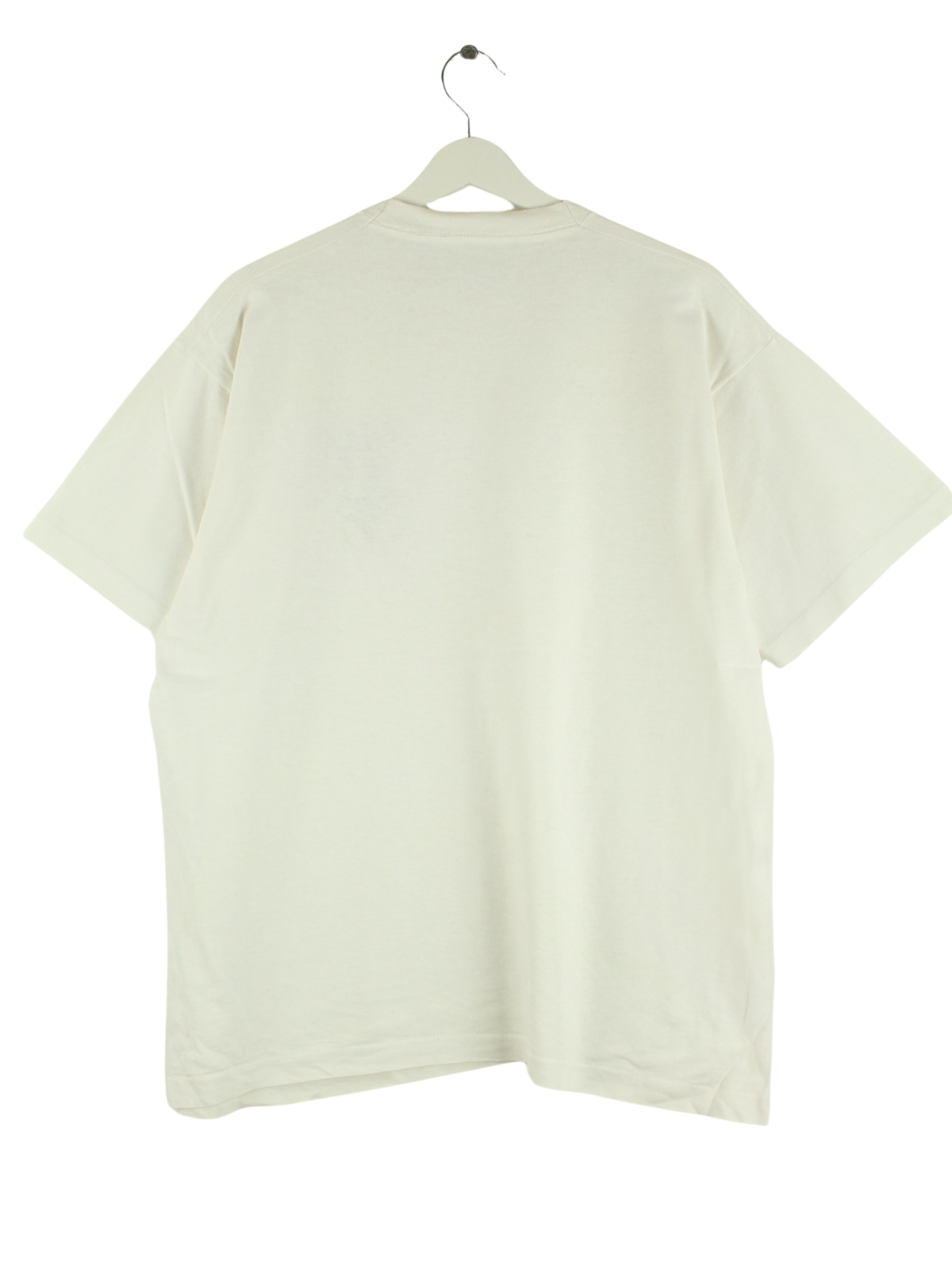 Vintage t-shirt with embroidery in size L from the 90's. It is made of a cotton blend and in stock in white.