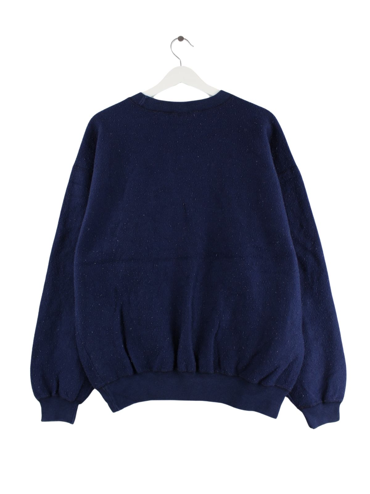 Blauer Vintage Sweater aus den 90'ern in Größe M. Er ist aus einer Baumwollmischung produziert. Den Zustand würden wir als 'In Ordnung' bezeichnen (vergl. Bilder).