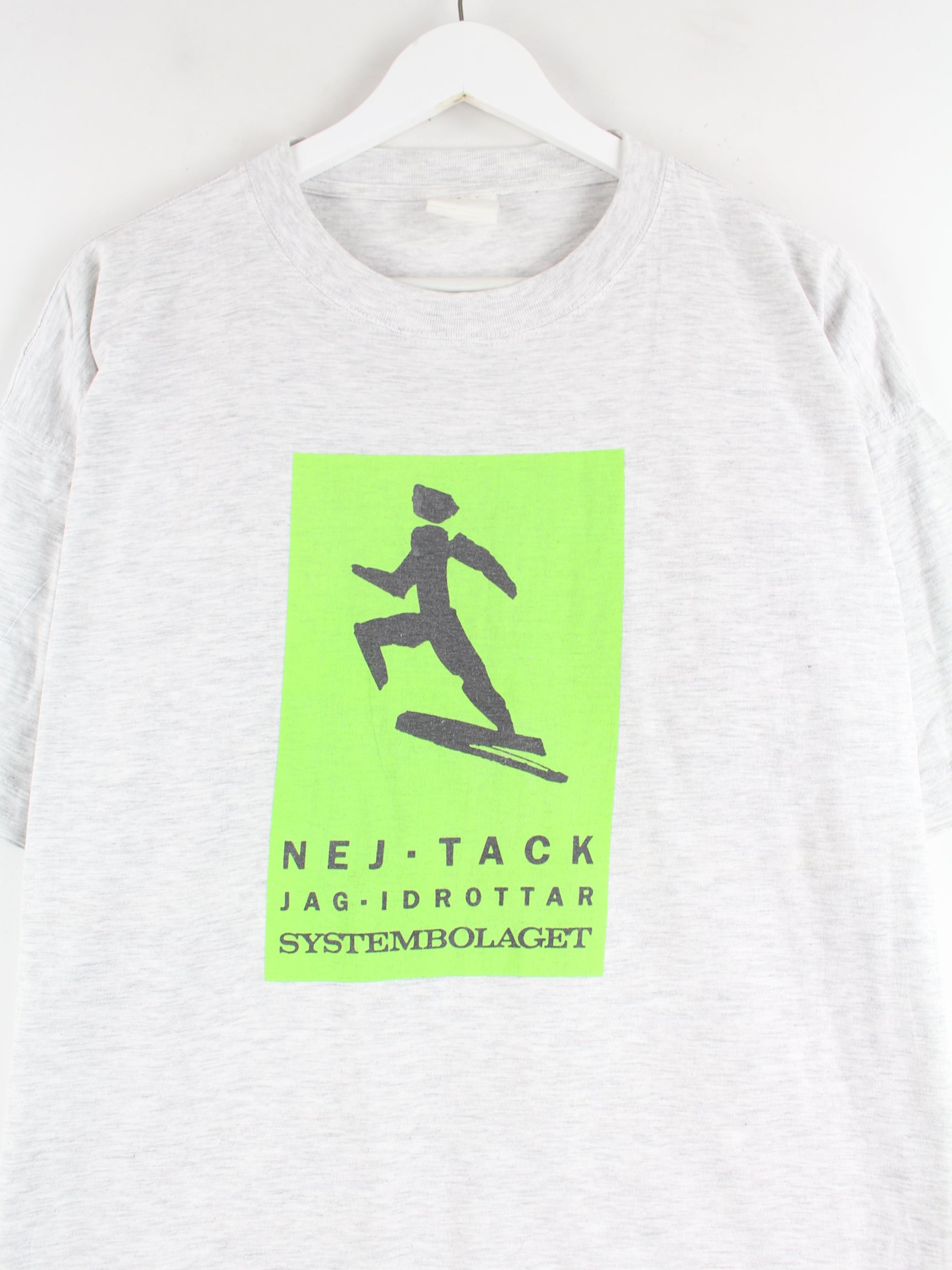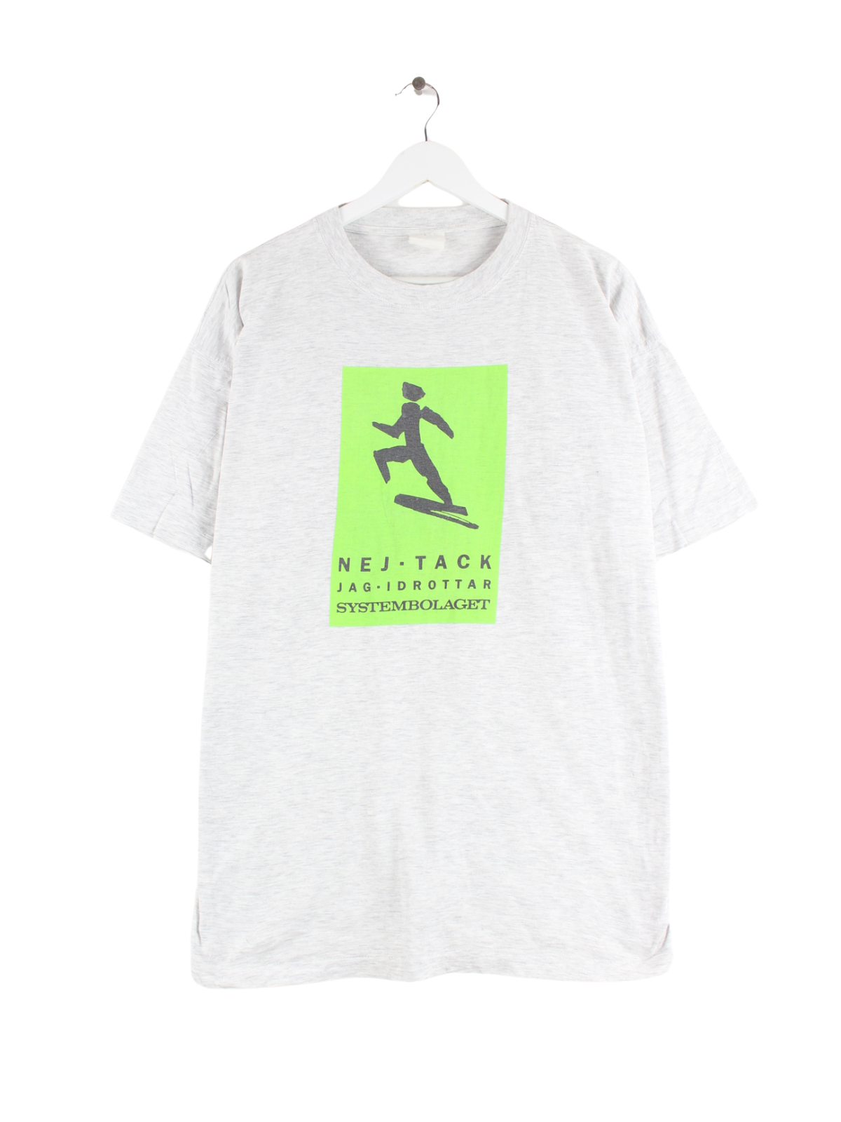 Grey vintage T-shirt from the 90's in size XL. It is made from a cotton blend and is in very good condition. With a chic 90's print.