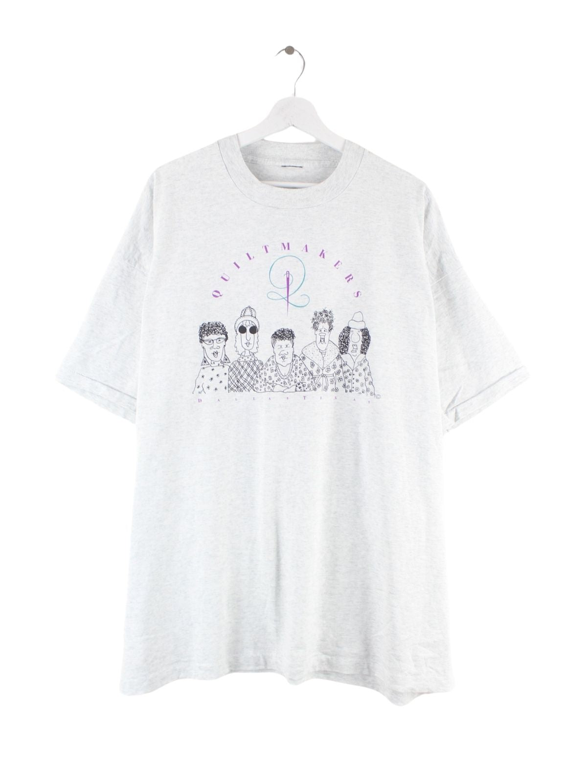 Vintage T-Shirt in Größe XXL aus den 90'ern. Es ist aus Baumwolle gefertigt und in Grau bei uns zu bekommen. Mit tollem Quiltmakers Print.