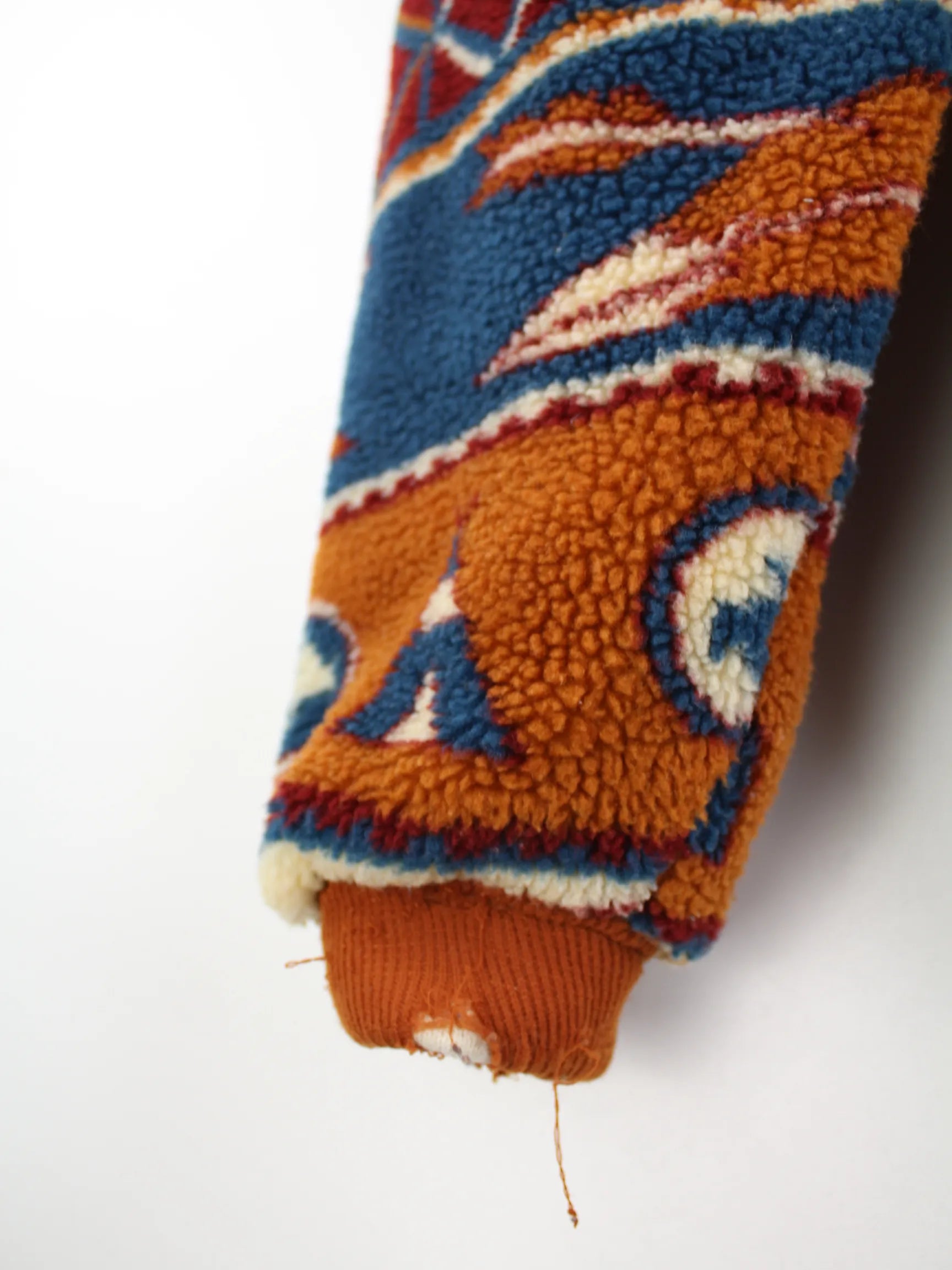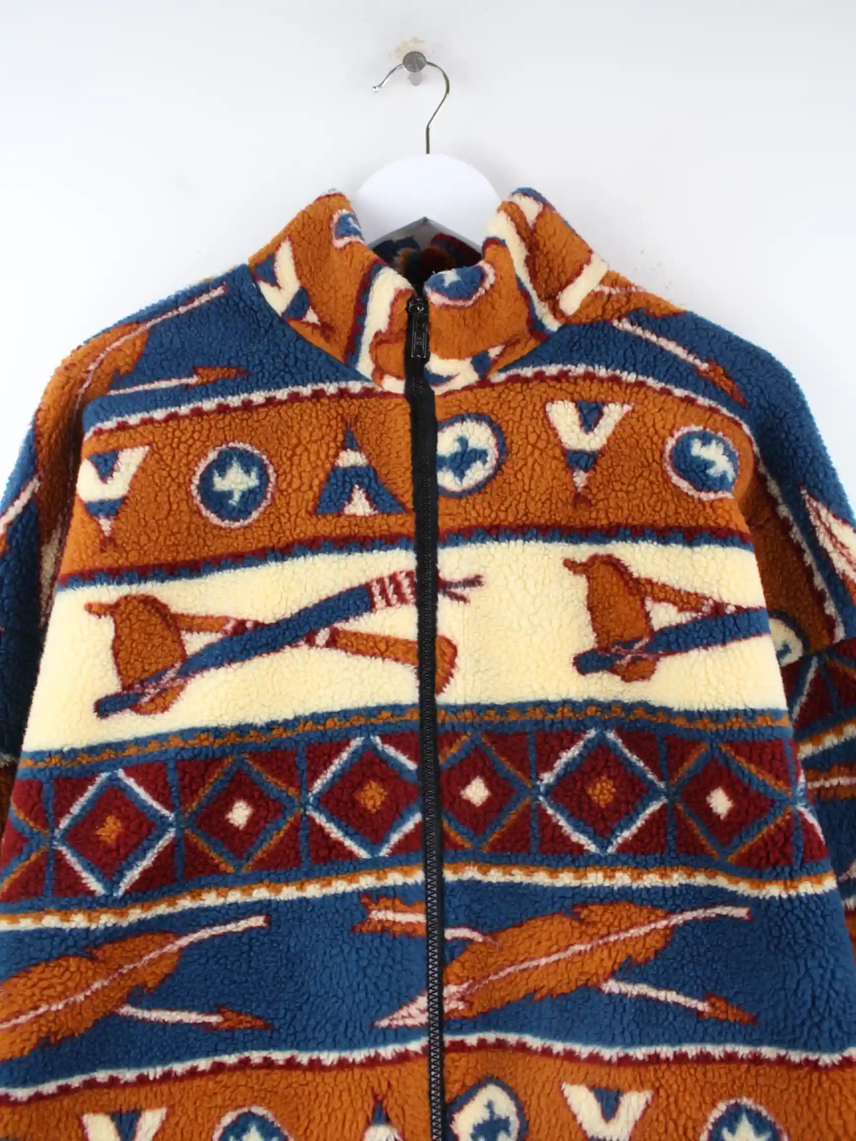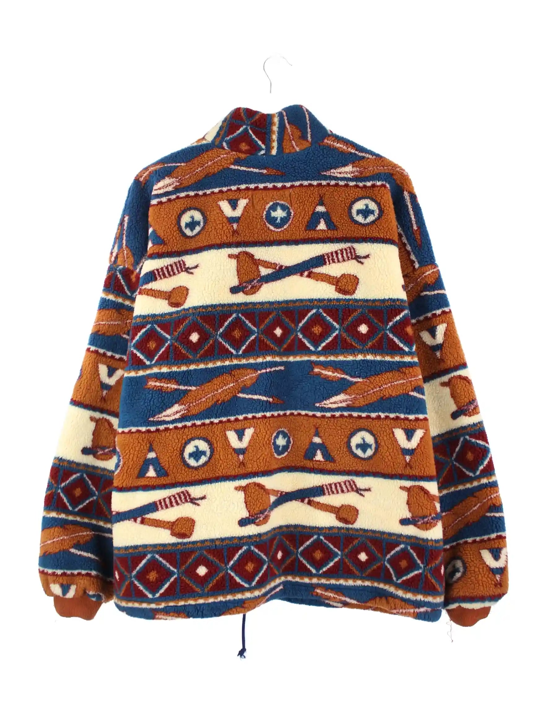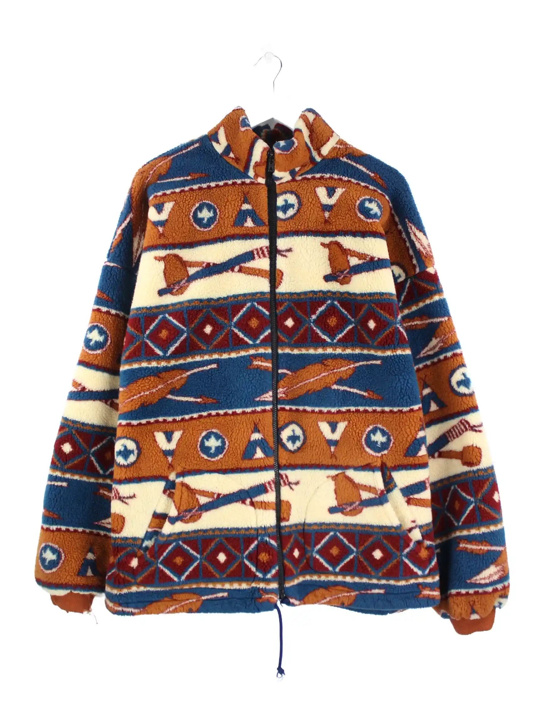 Vintage Jacke in Größe XXL aus den 90'ern. Sie ist aus behaglichem Fleece gefertigt und in bunten Farben im Angebot.
