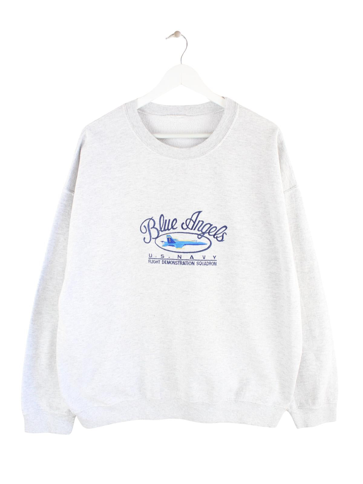 Vintage Sweater in Größe M aus den 90'ern. Er ist aus einer Baumwollmischung und in Grau im Bestand.
