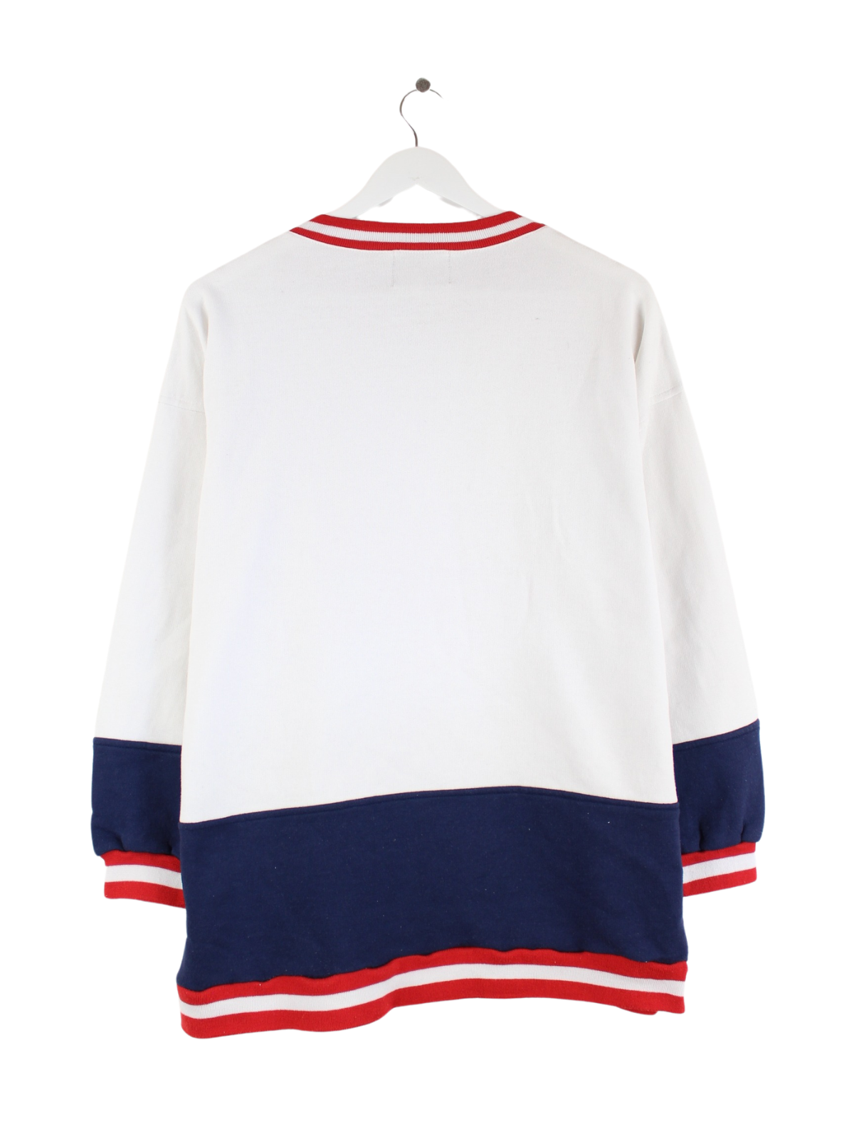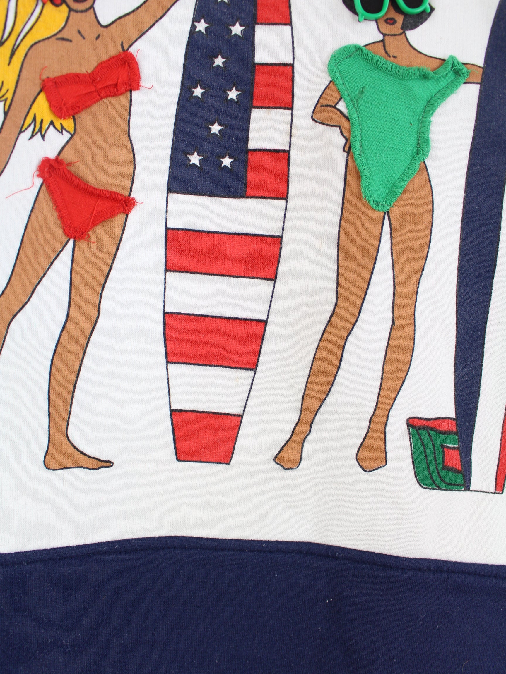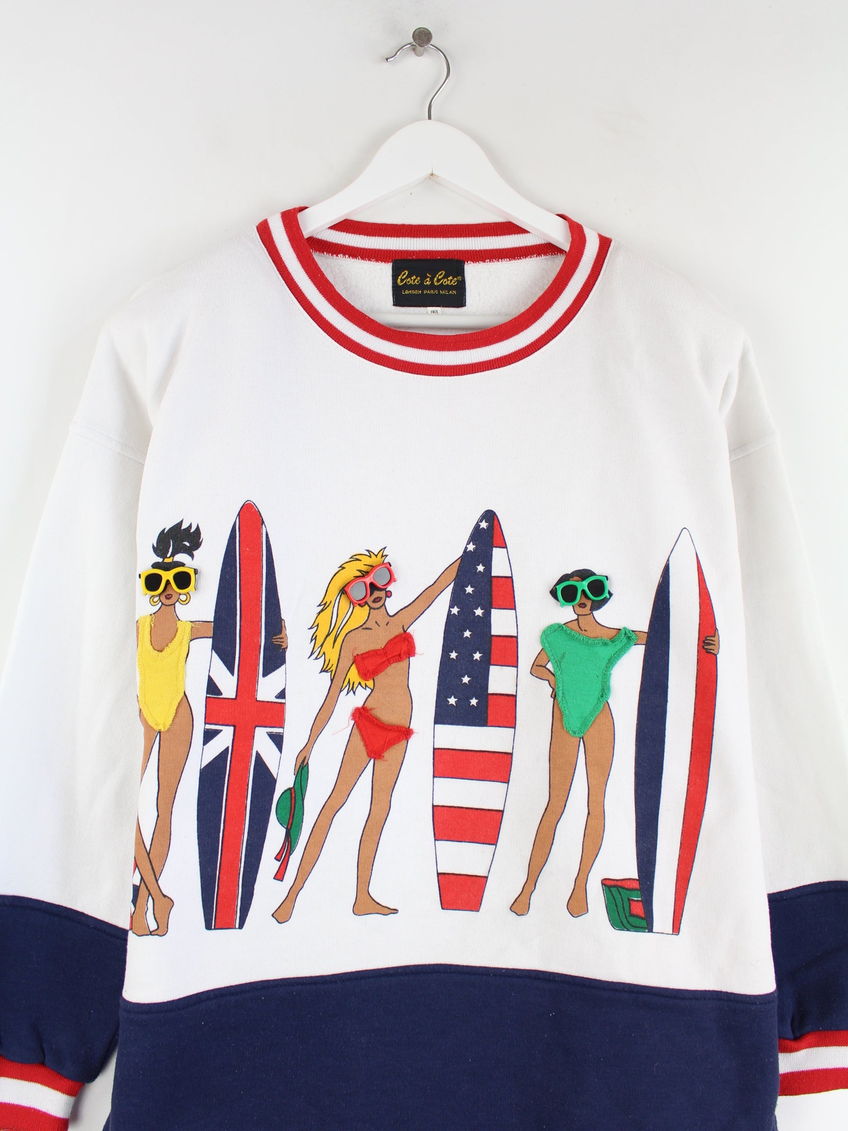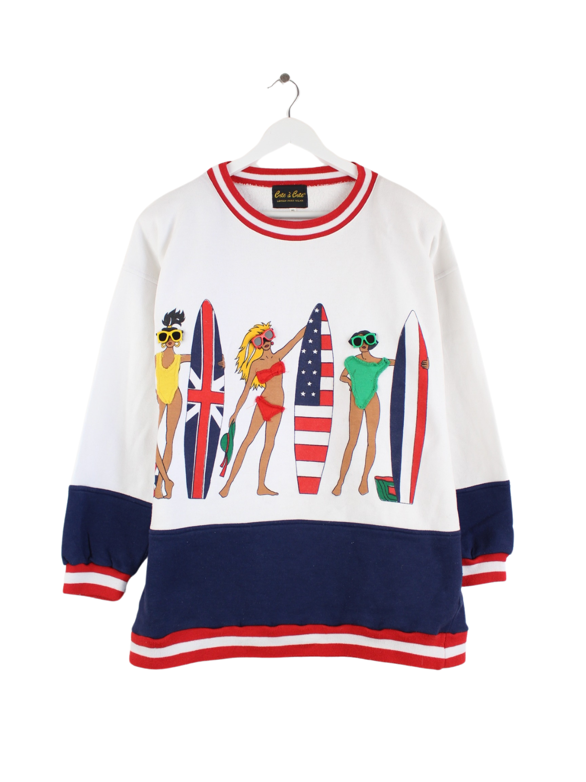 Vintage sweater in size XL from the 90's. It is made of a cotton blend and is available in white. With a chic beach print.