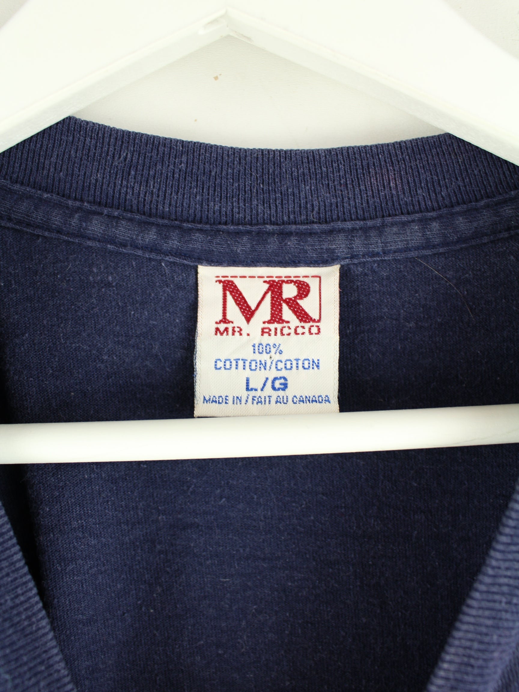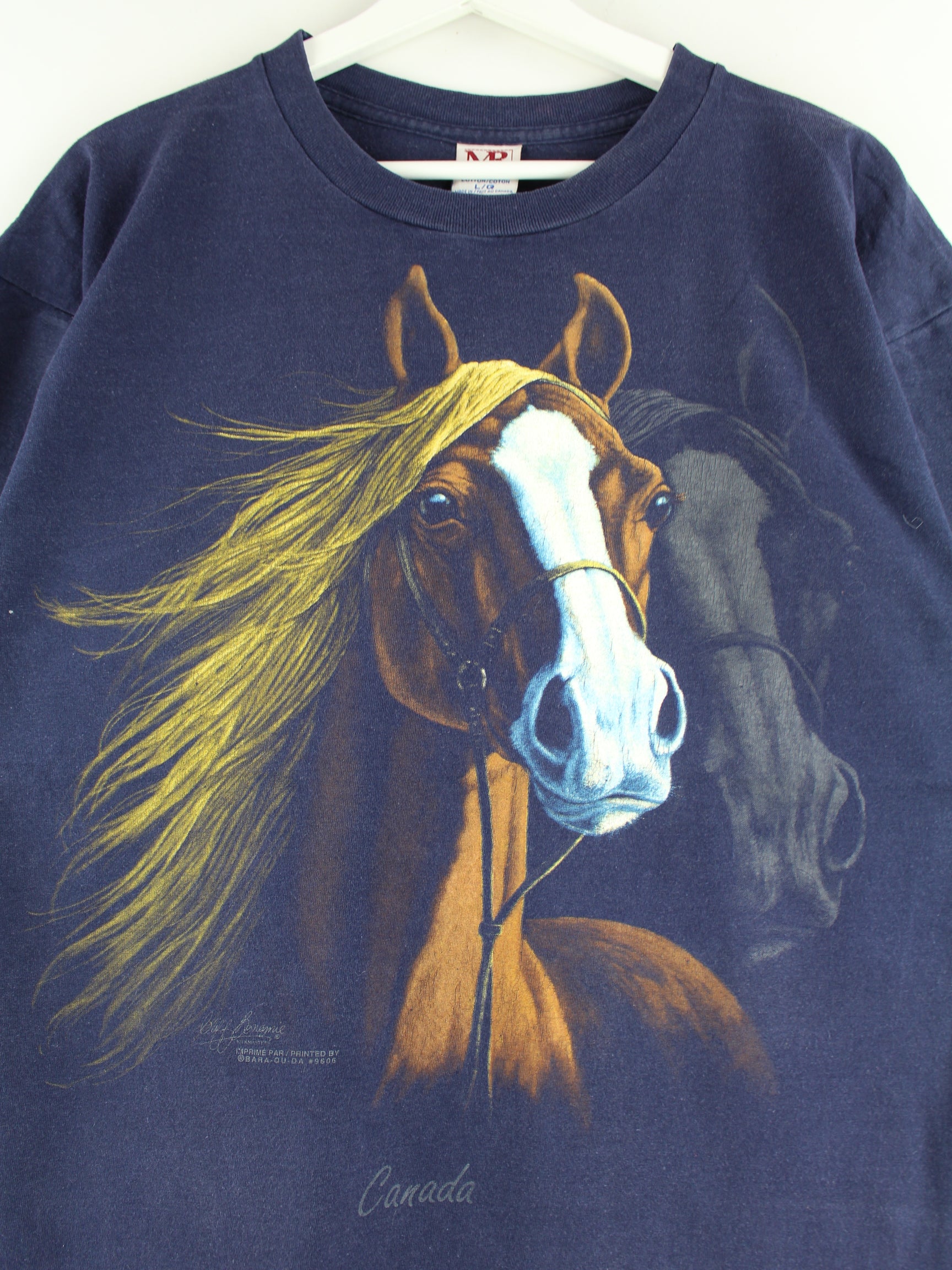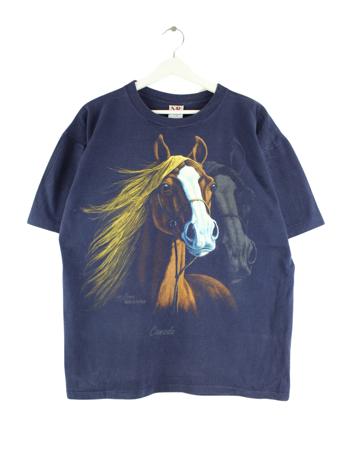 Vintage T-shirt in size L from the 90's. It is made of cotton and available in blue. With a chic horse print.