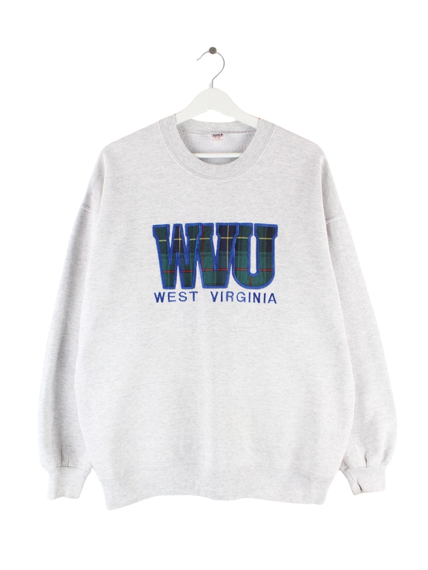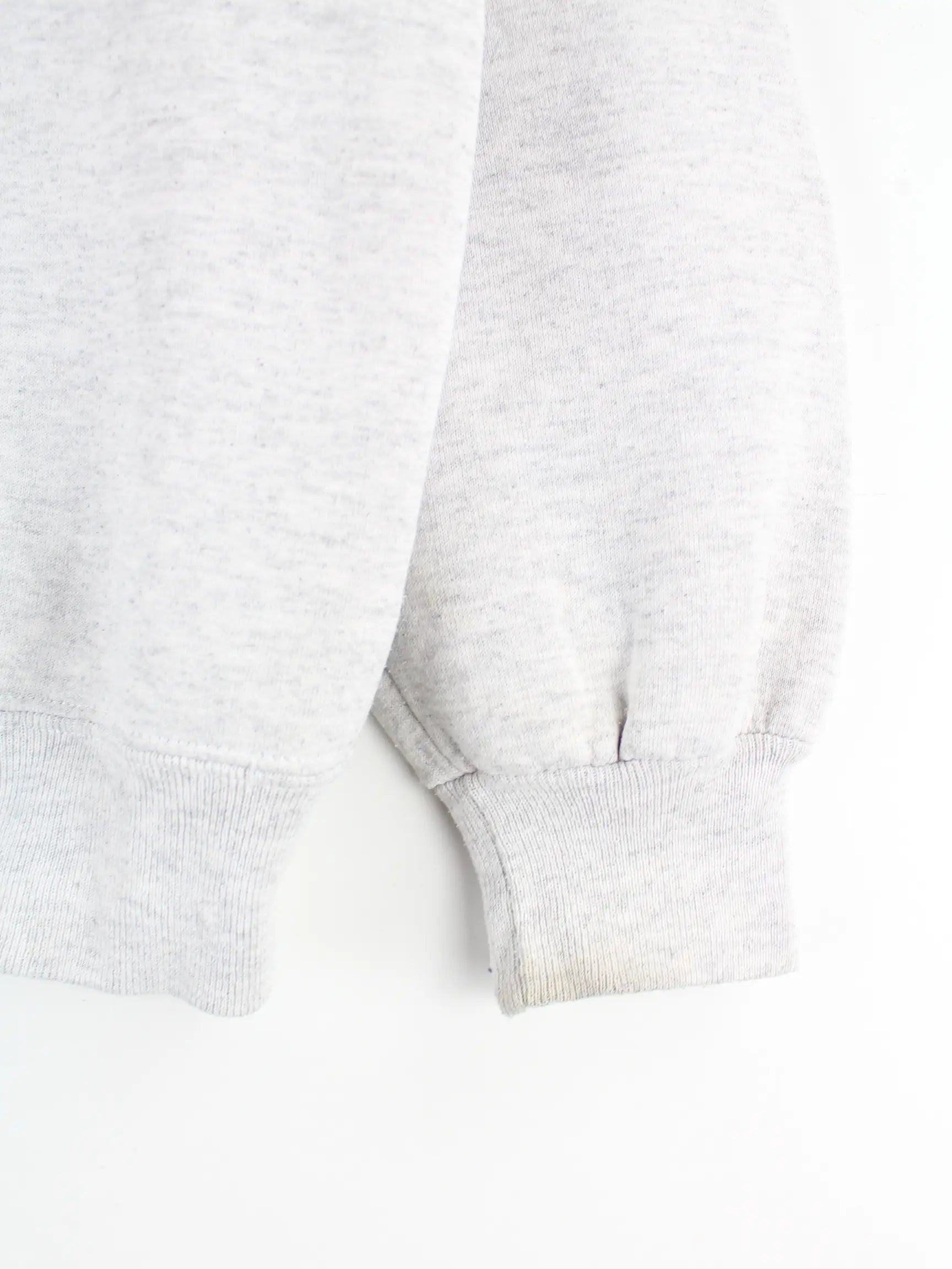 Vintage Sweater in Größe XL aus den 90'ern. Er ist aus einer Baumwollmischung hergestellt und in Grau bei uns vorrätig.
