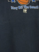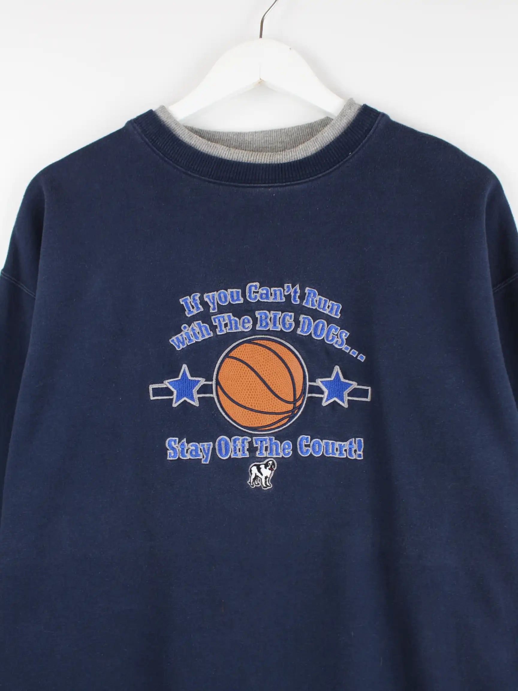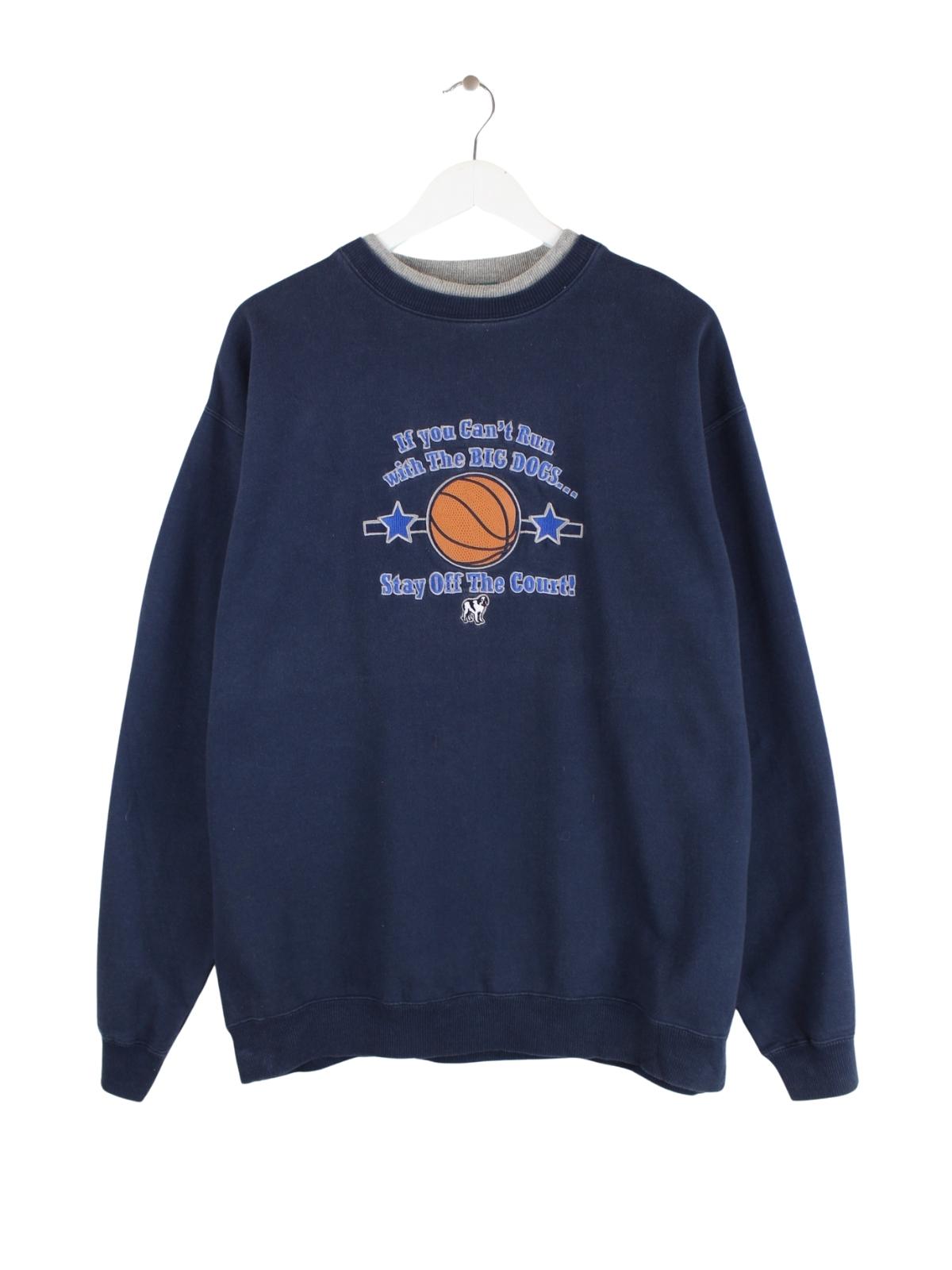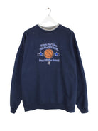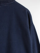 Blauer Vintage Sweater in Größe M. Er ist aus einer Baumwollmischung gefertigt. Den Zustand würden wir als 'In Ordnung' bezeichnen (vergl. Bilder).