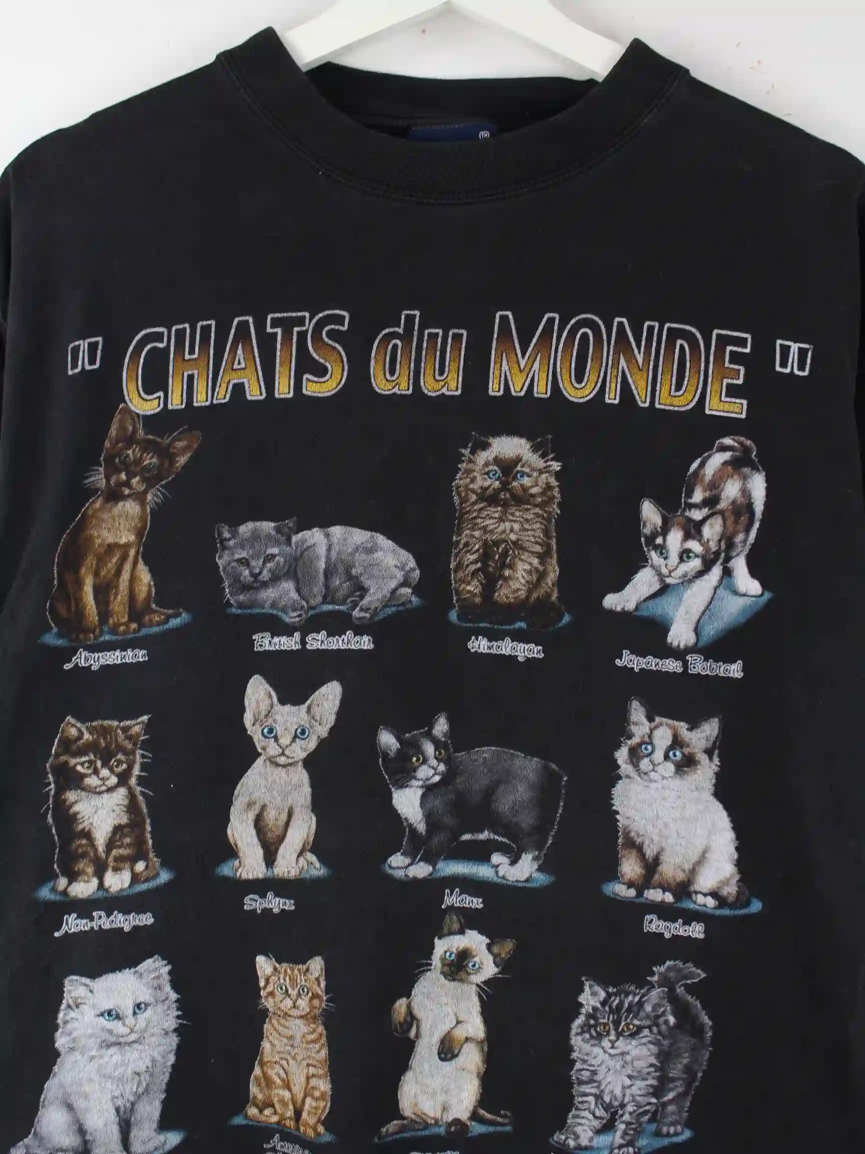 Vintage T-Shirt in Größe L. Es ist aus einer Baumwollmischung hergestellt und in Blau in Stock. Mit seltenem Cats Print.