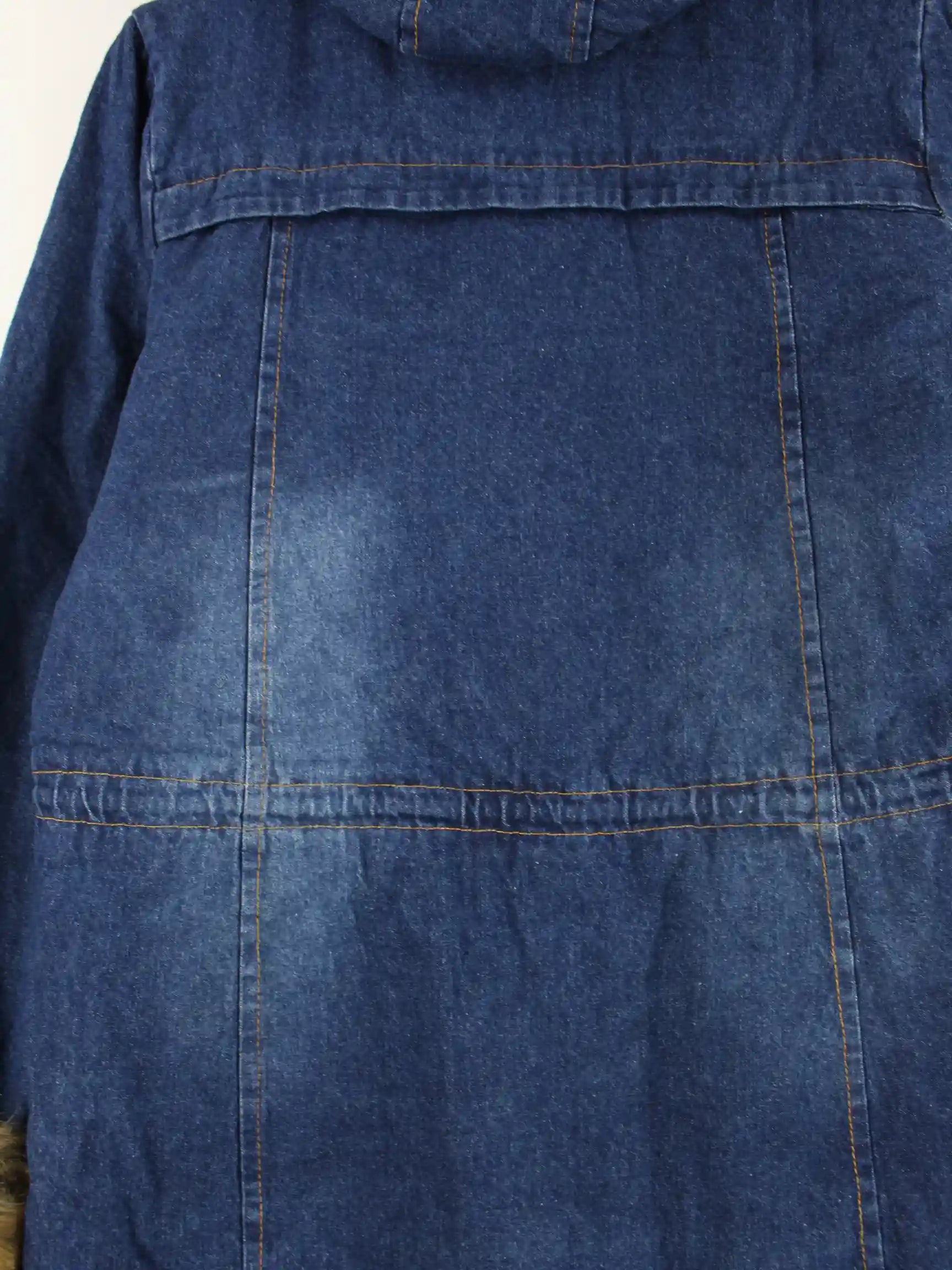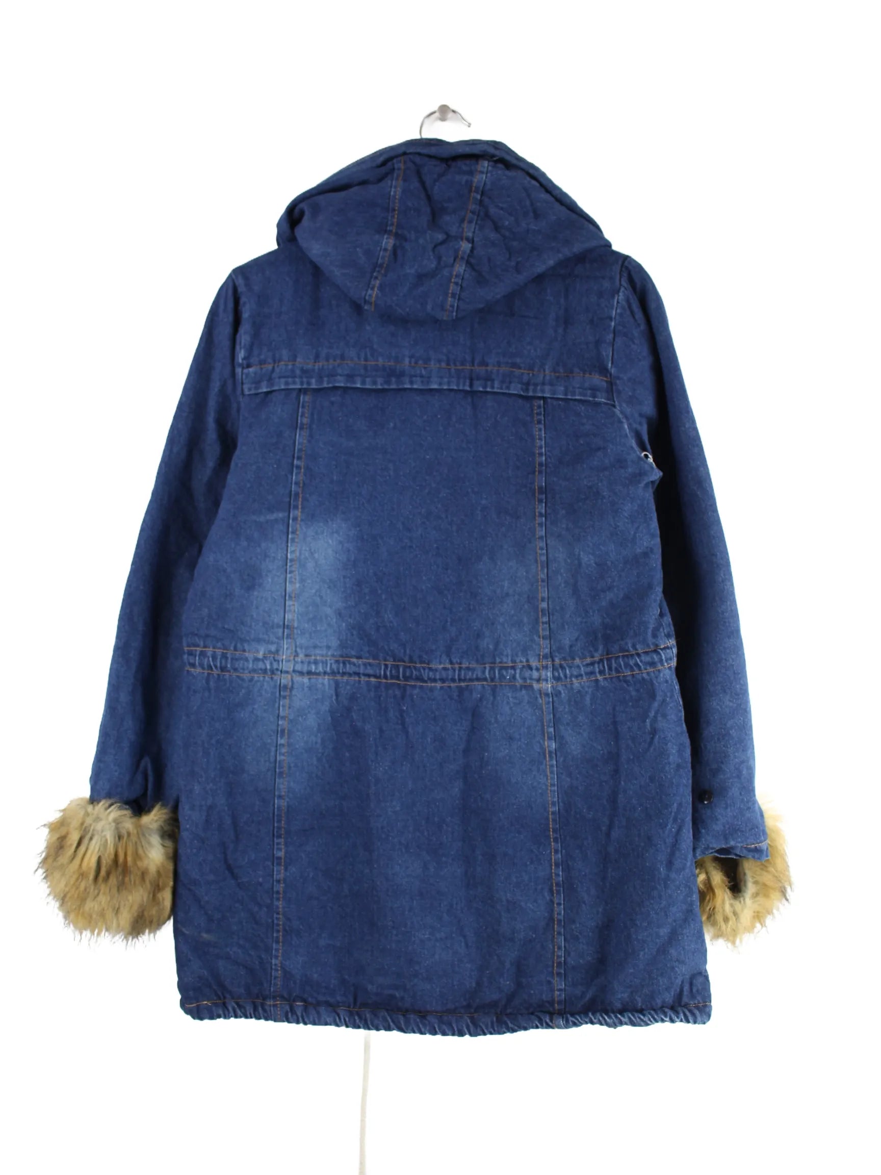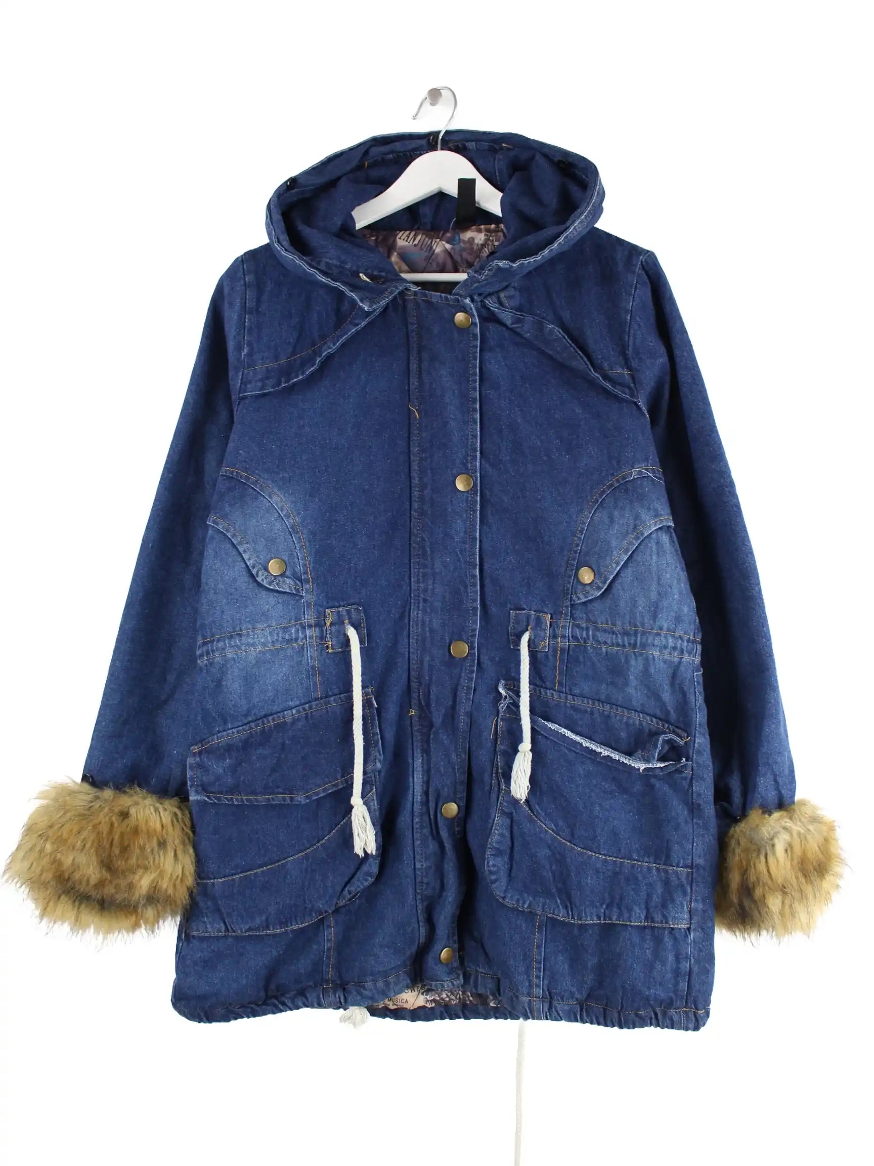 Vintage Jacke in Größe L aus den 90'ern. Sie ist aus Baumwolle angefertigt und in Blau lieferbar.