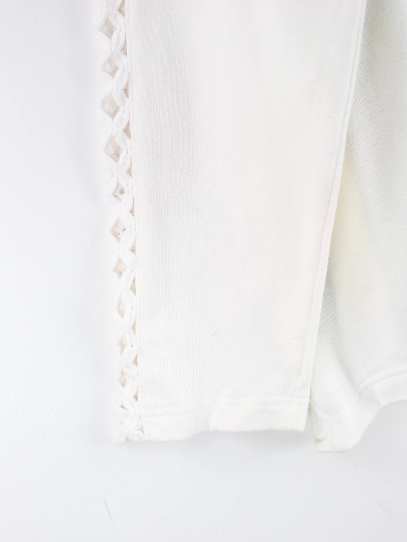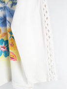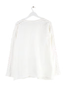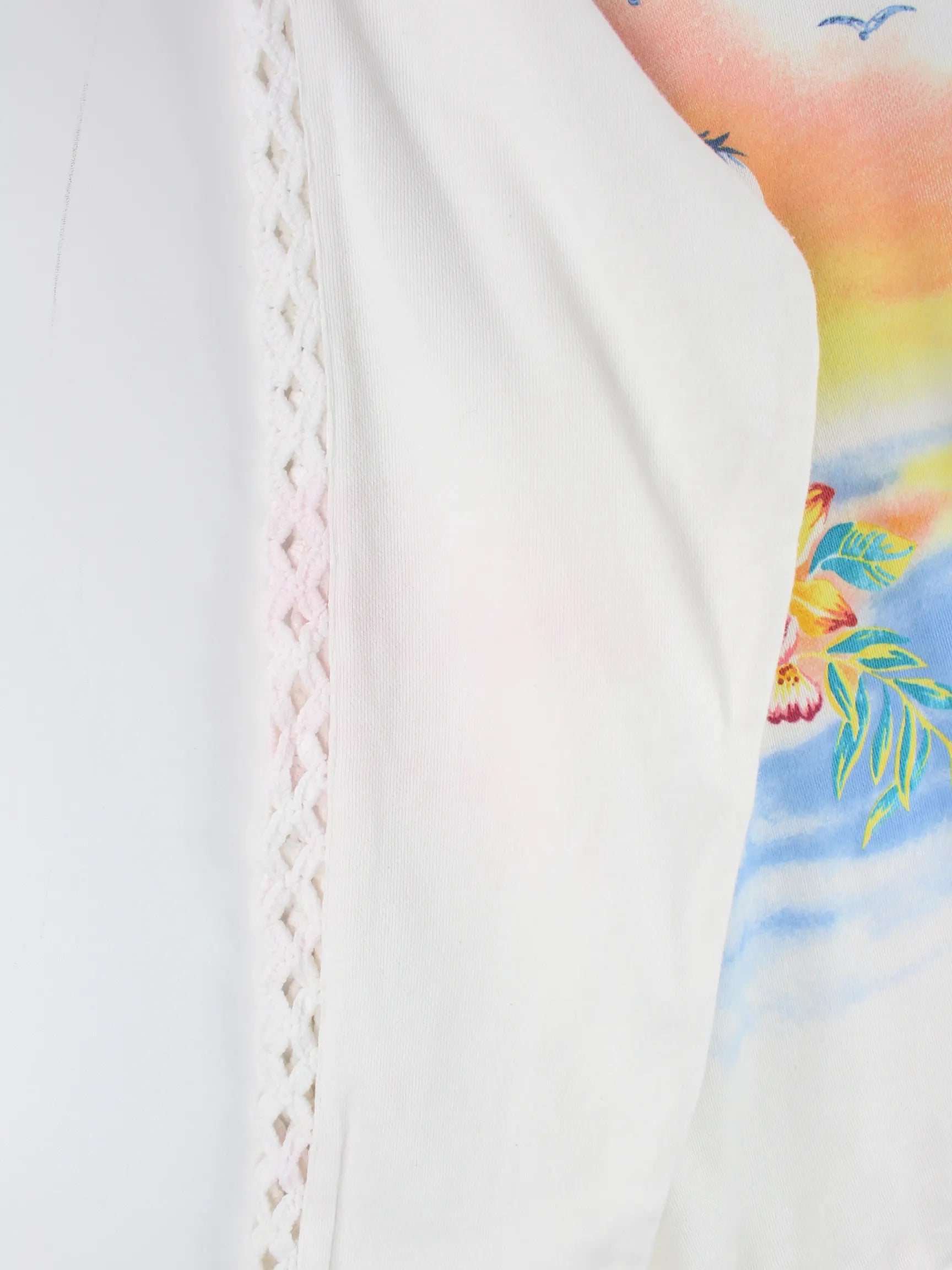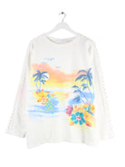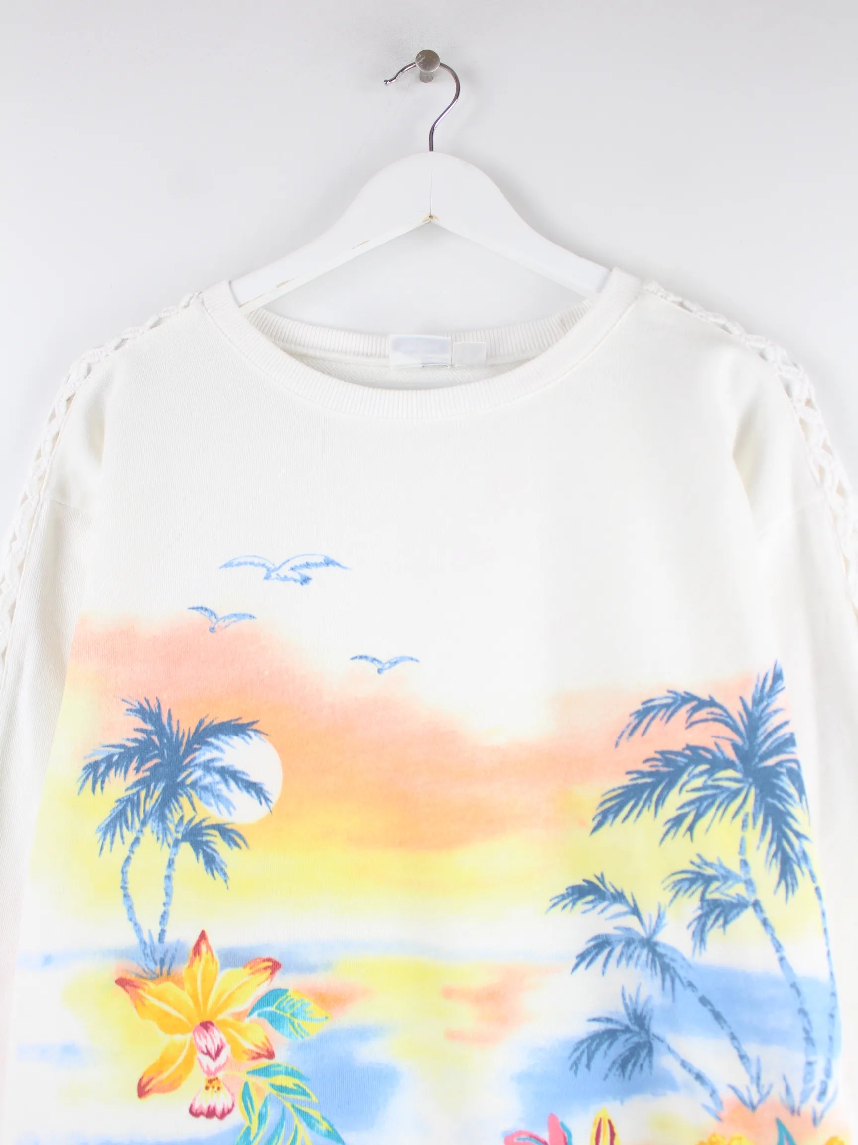 Vintage Sweater in Größe L. Er ist aus einer Baumwollmischung und in Weiß bei uns vorrätig. Mit schönem Hawaii Print.