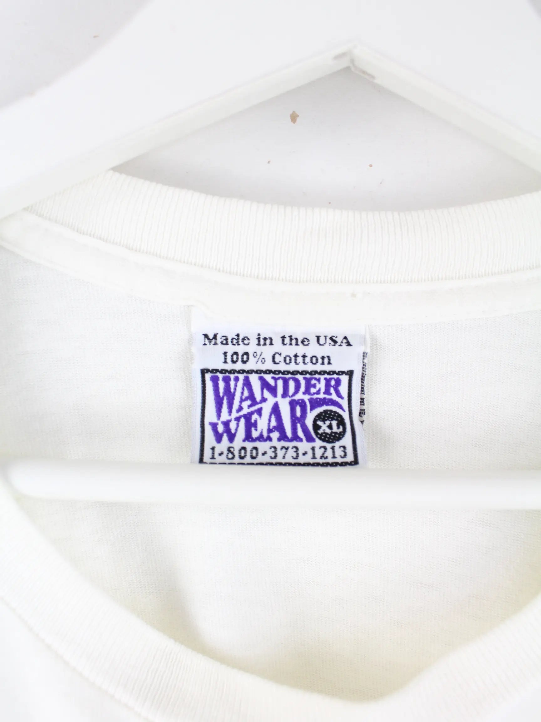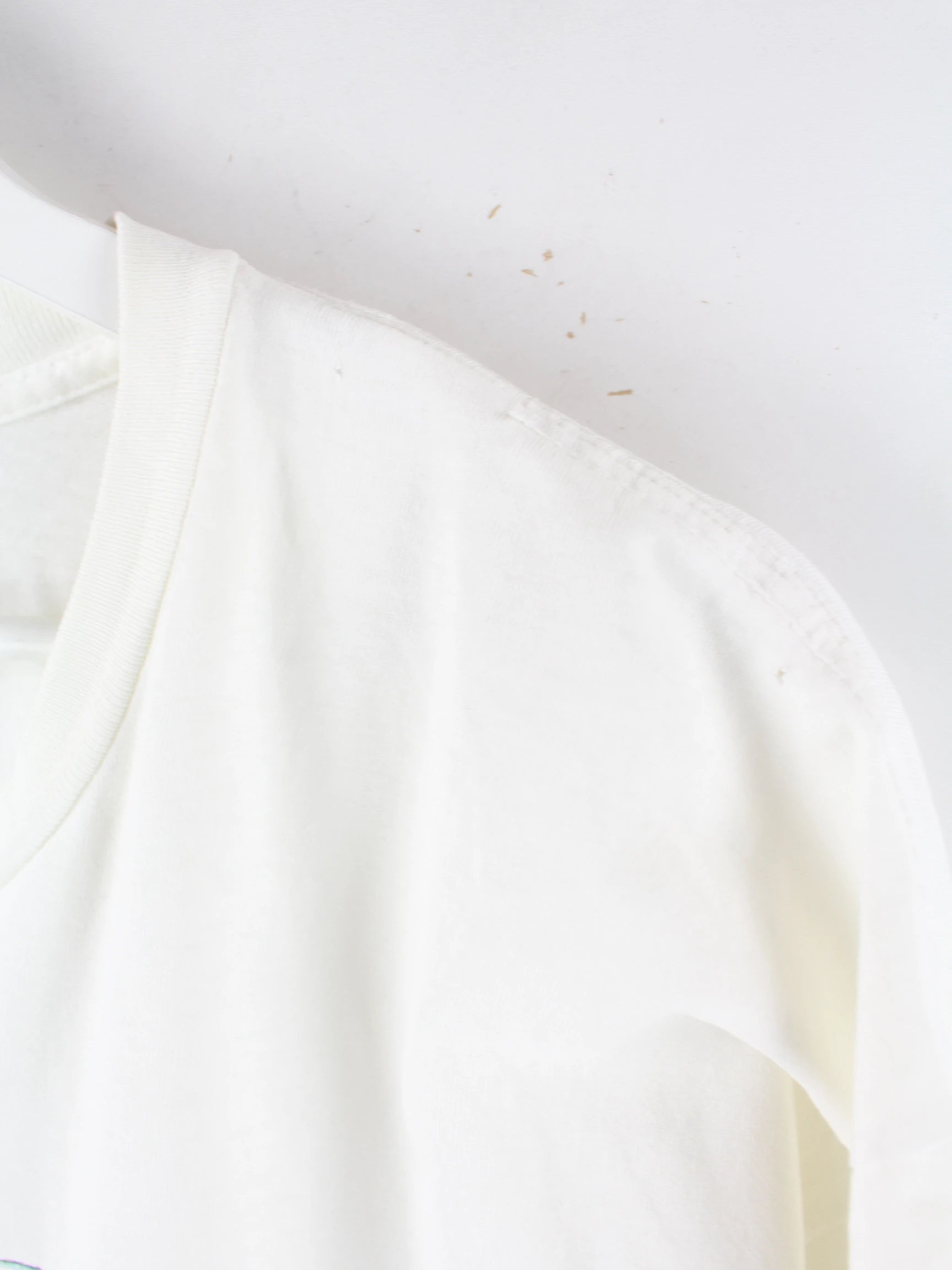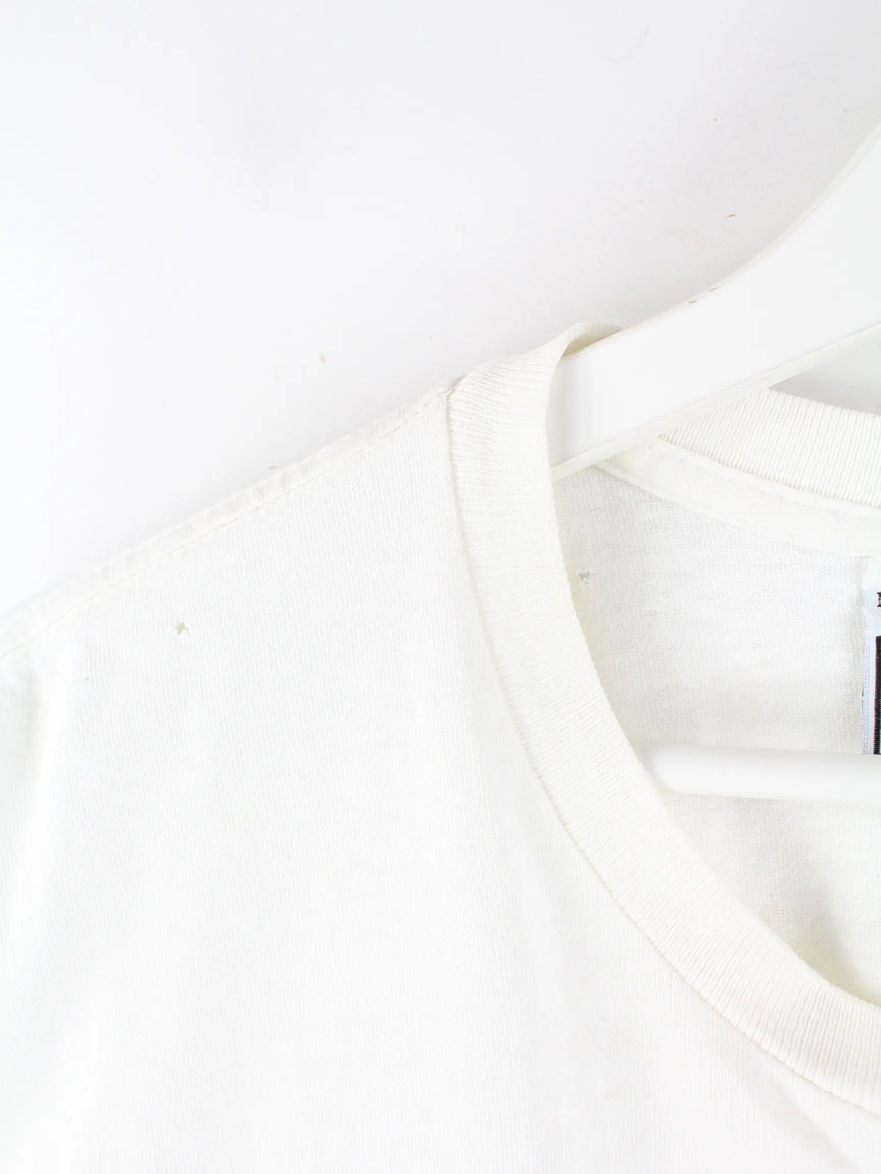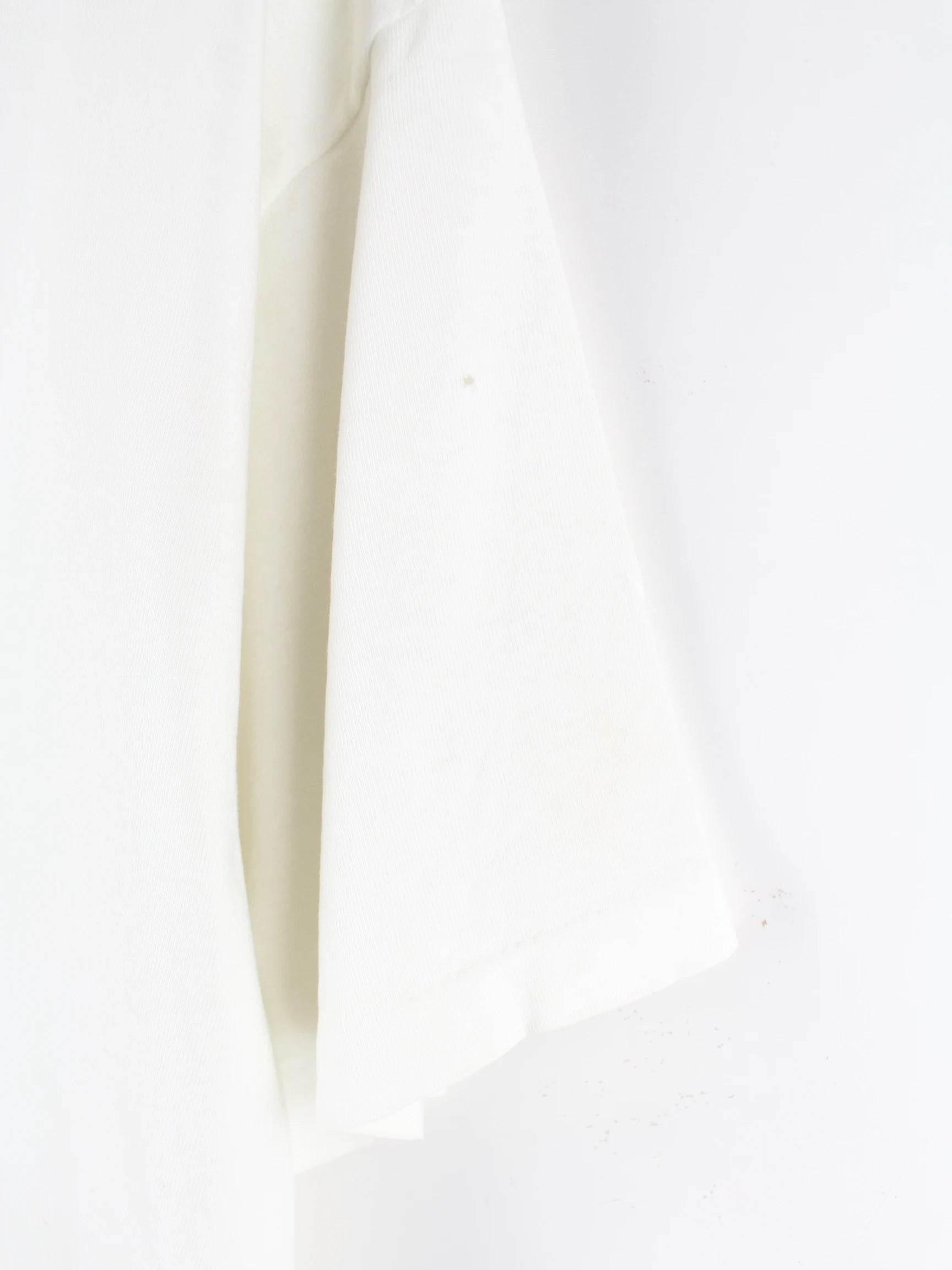Weißes Vintage T-Shirt in Größe XL. Es ist aus Baumwolle gemacht. Den Zustand würden wir als 'In Ordnung' bezeichnen (vergl. Bilder).