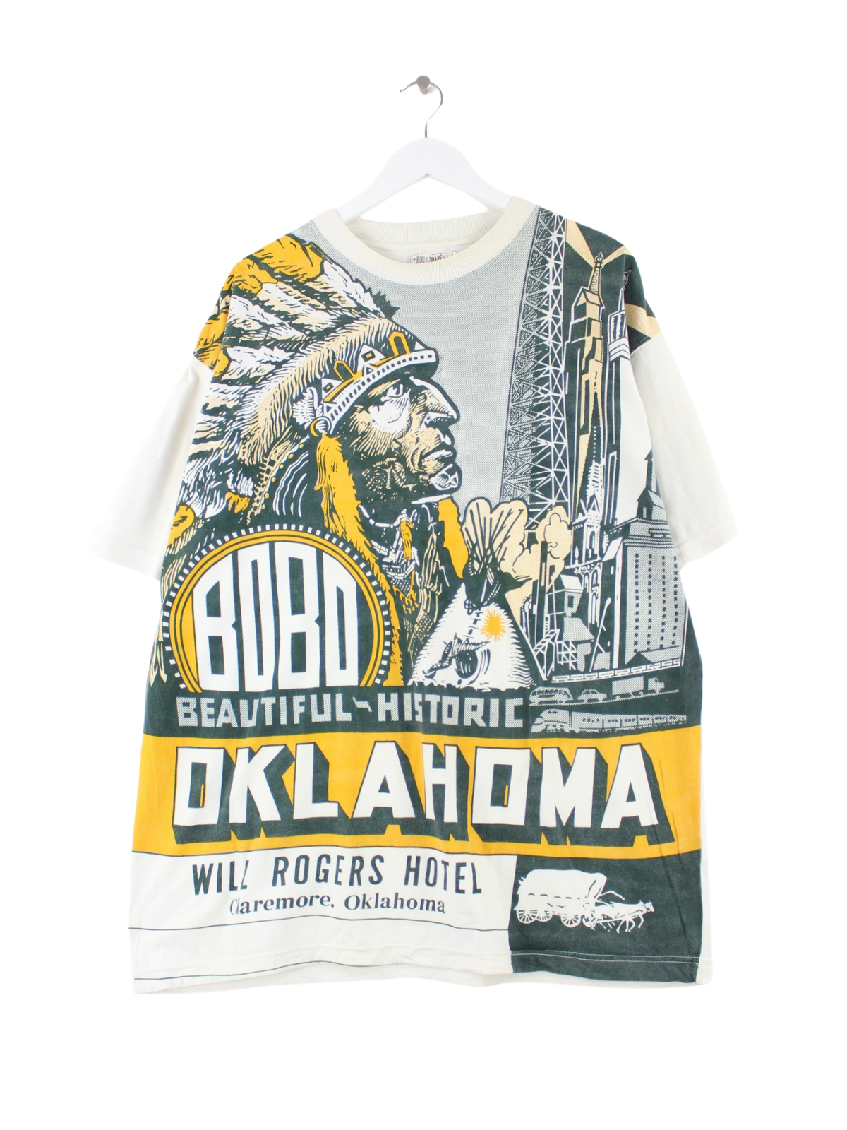 Vintage T-shirt in size XL. It is made of cotton and available in white. With a great Oklahoma print.