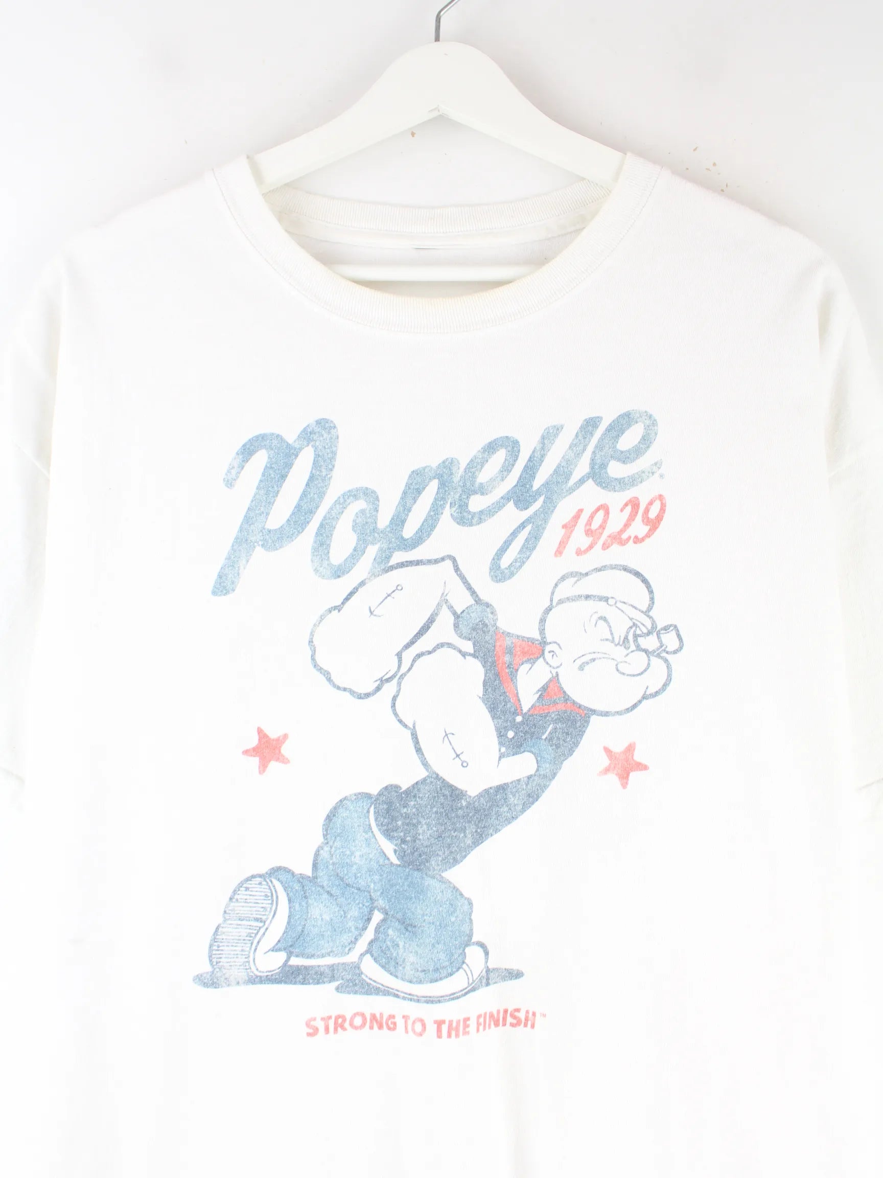 Vintage T-Shirt in Größe XL. Es ist aus Baumwolle angefertigt und in Weiß in Stock. Mit schönem Popeye Print.