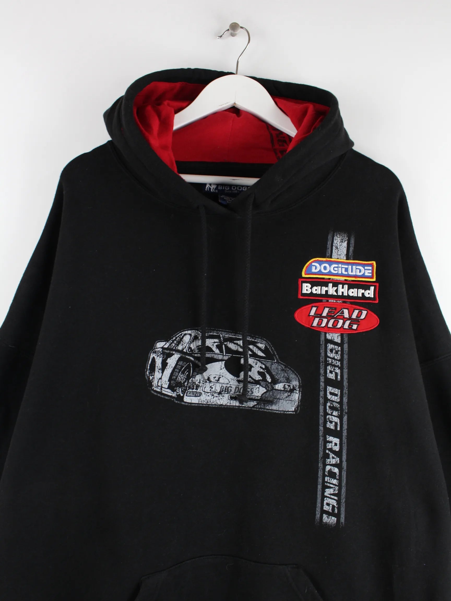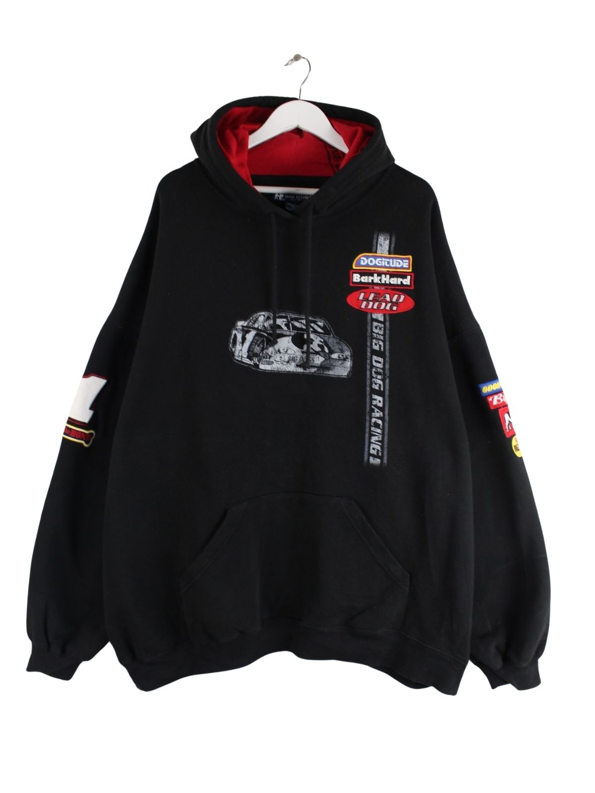 Vintage Hoodie in Größe 4XL. Er ist aus einer Baumwollmischung hergestellt und in Schwarz lieferbar. Mit chiquem Racing Print.