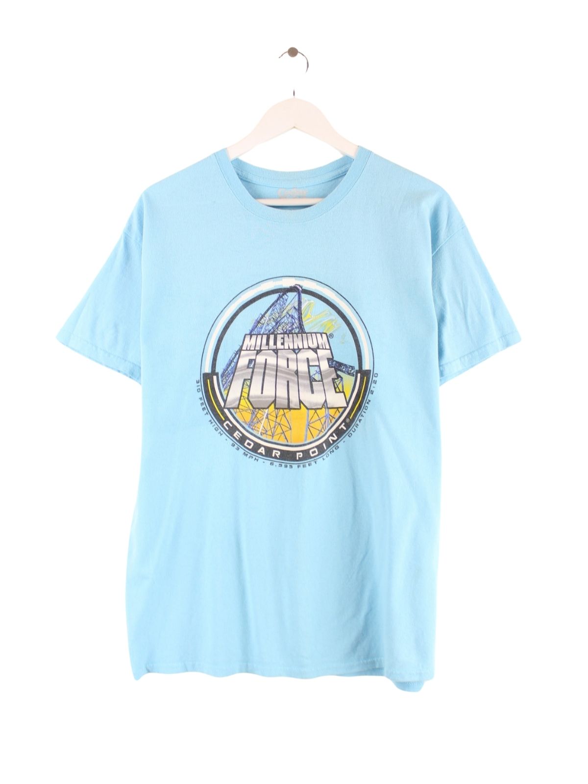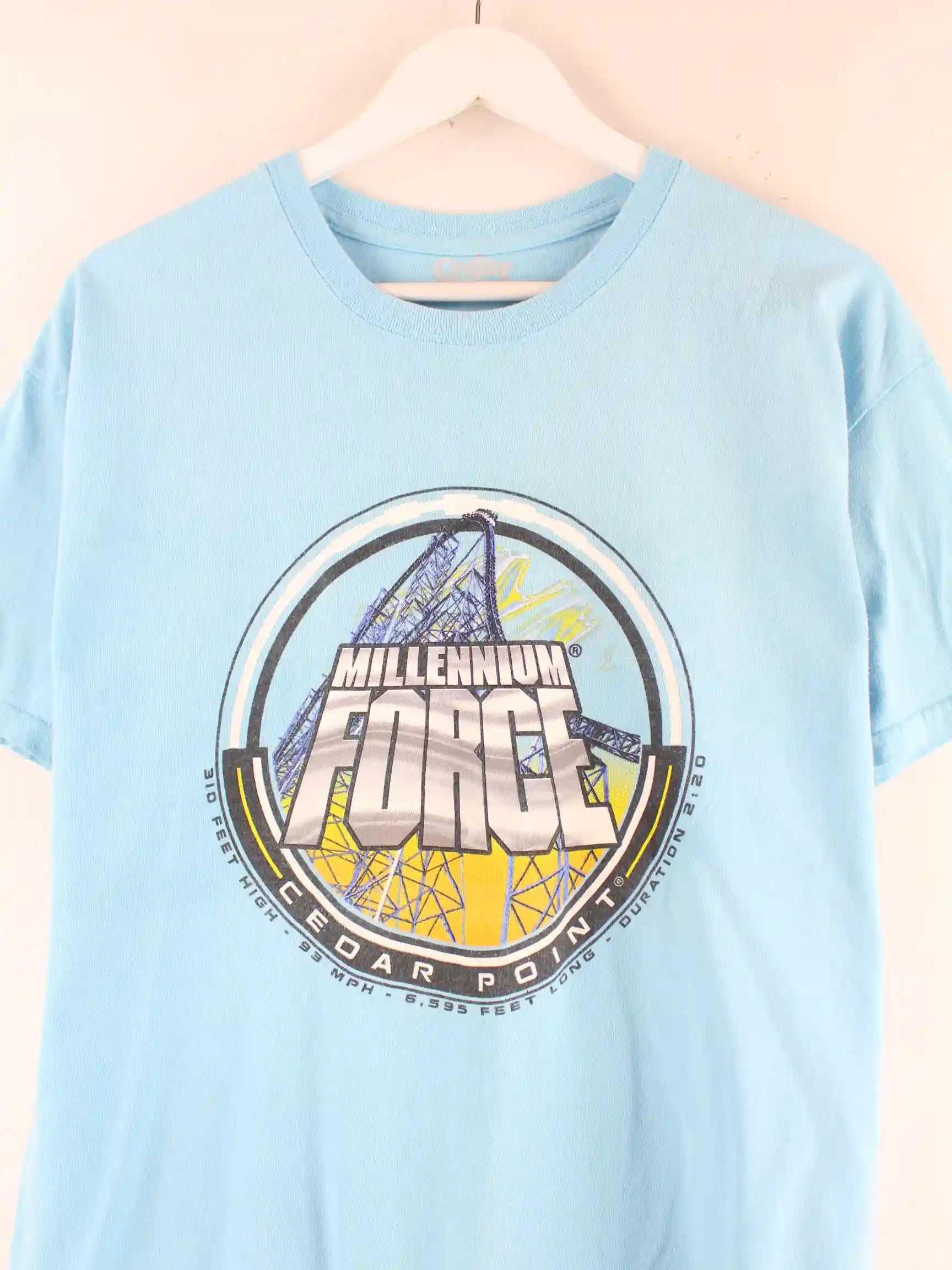 Vintage T-Shirt in Größe XL. Es ist aus einer Baumwollmischung hergestellt und in Türkis zu haben. Mit seltenem Rollercoaster Print.