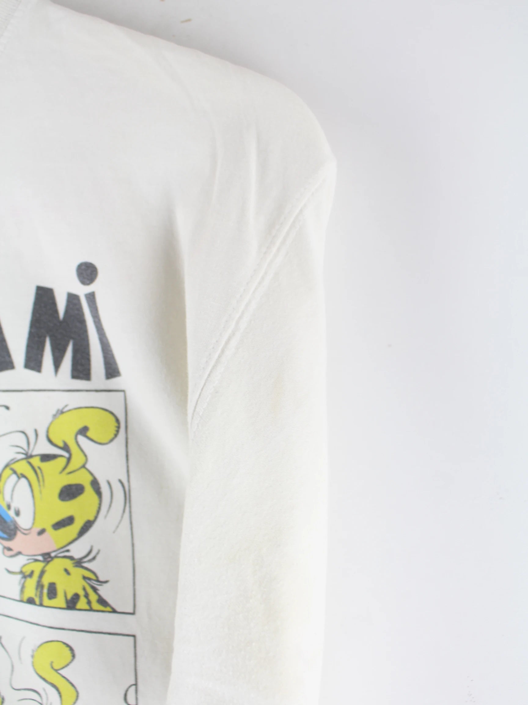 Vintage T-Shirt in Größe S aus den 90'ern. Es ist aus Baumwolle angefertigt und in Weiß bei uns vorrätig. Mit tollem Marsupilami Print.