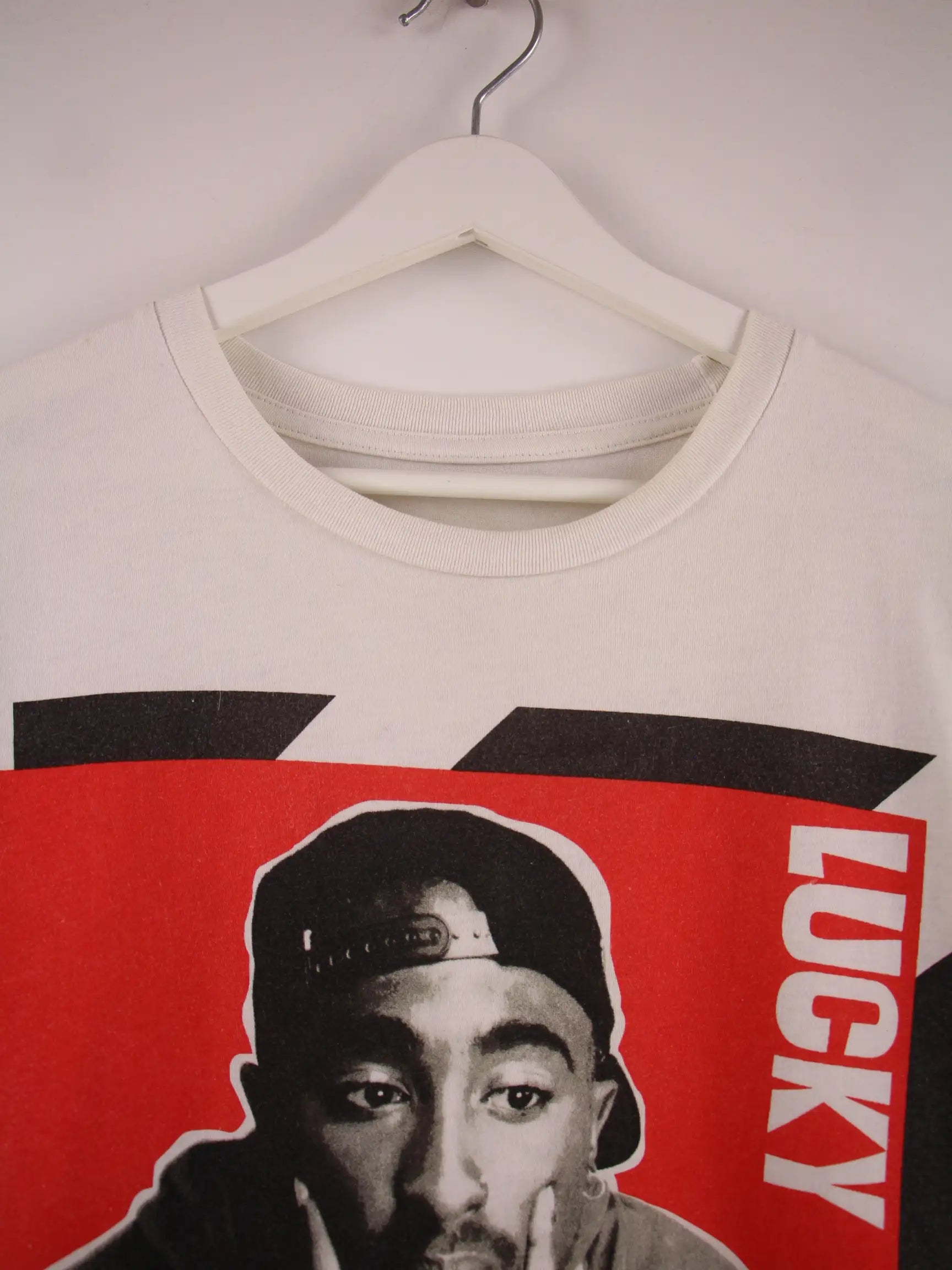 Vintage Sweatshirt in Größe M. Es ist aus Baumwolle produziert und in Weiß in Stock. Mit schickem Shakur Print.
