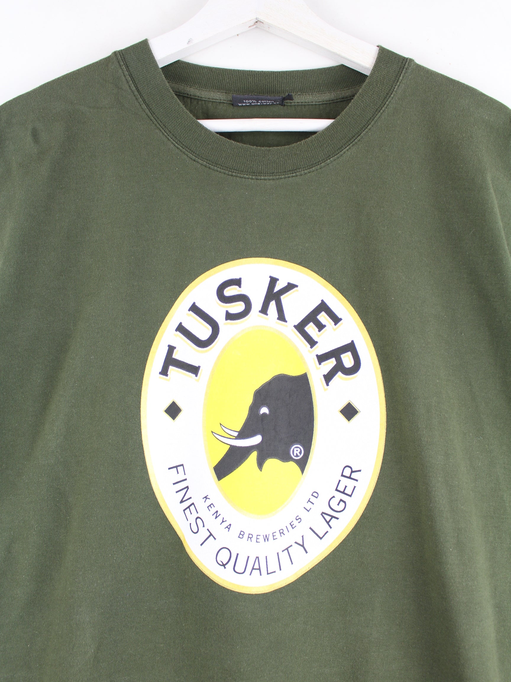 Vintage T-shirt in size XL. It is made of cotton and comes in green. With a chic Tusker print.