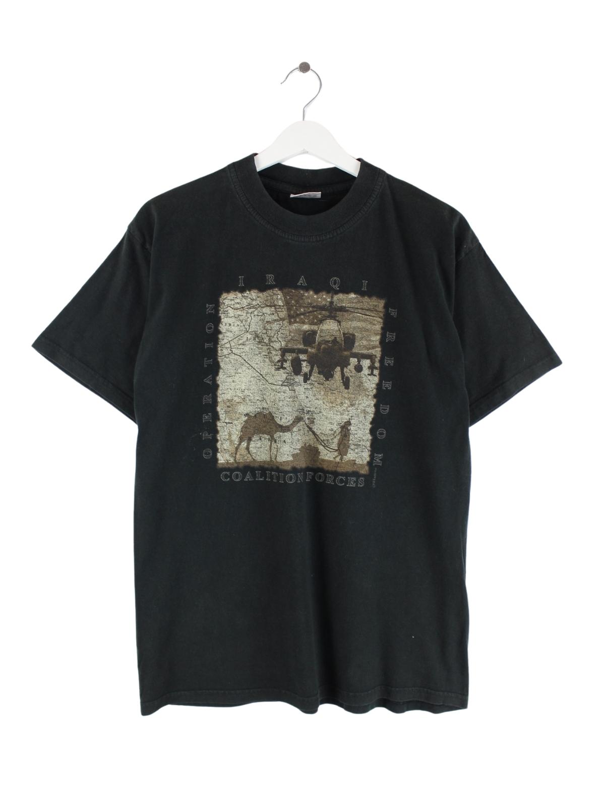 Schwarzes Vintage T-Shirt in Größe M. Es ist aus Baumwolle produziert und in gutem Zustand bei uns vorrätig. Mit seltenem Army Print.