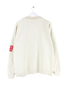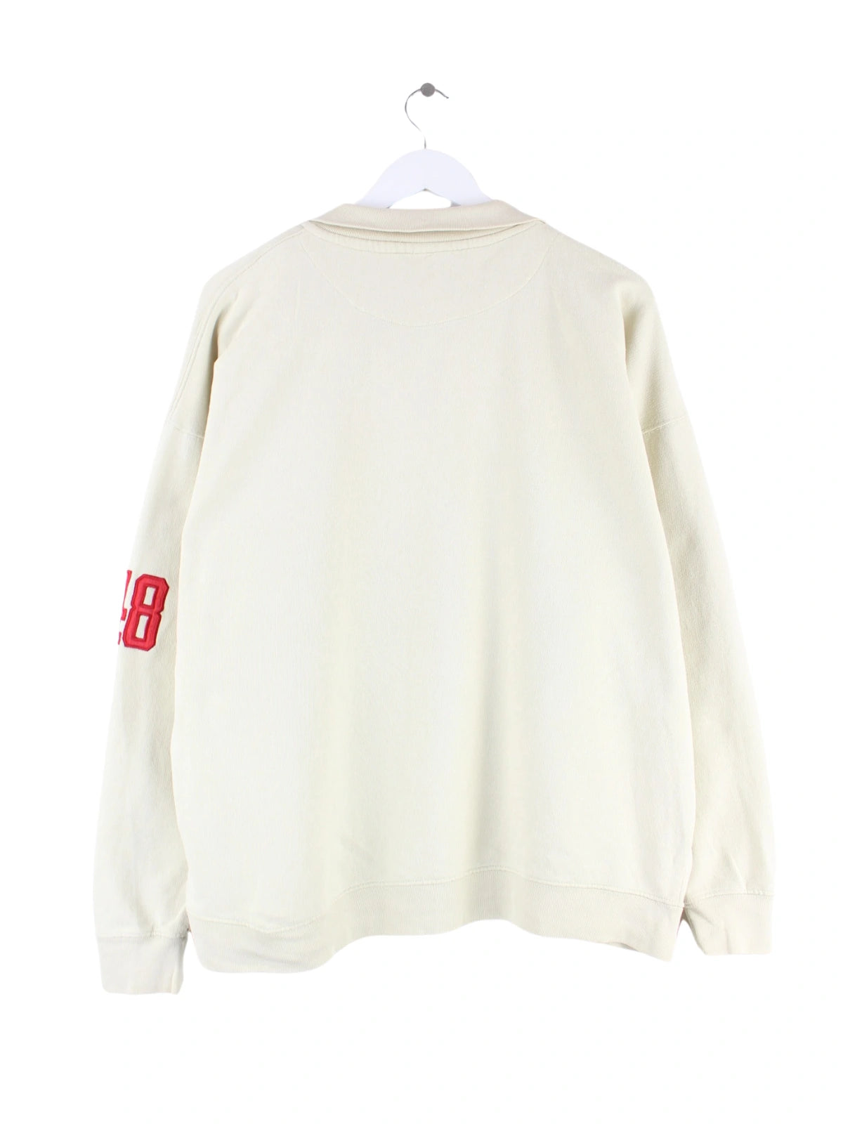 Vintage Sweater mit gesticktem Logo und half Zip in Größe XL. Er ist aus einer Baumwollmischung und in Beige bei uns zu bekommen.
