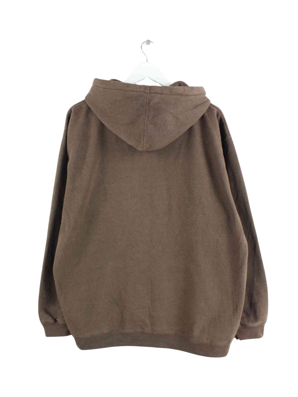 Vintage hoodie with embroidery in size L from the early 2000s. It is made of a cotton blend and comes in brown.