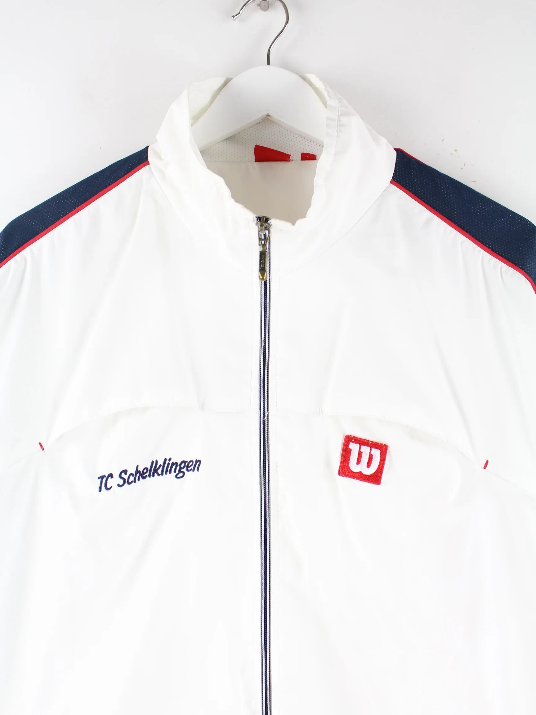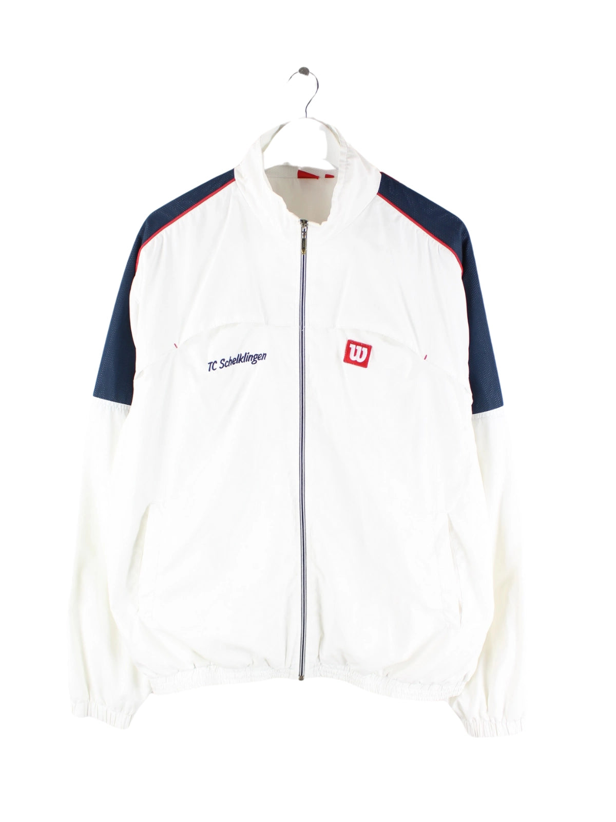 Weiße Trainingsjacke vom Brand Wilson in Größe L. Sie ist aus Synthetik gemacht und in sehr gutem Zustand im Angebot.